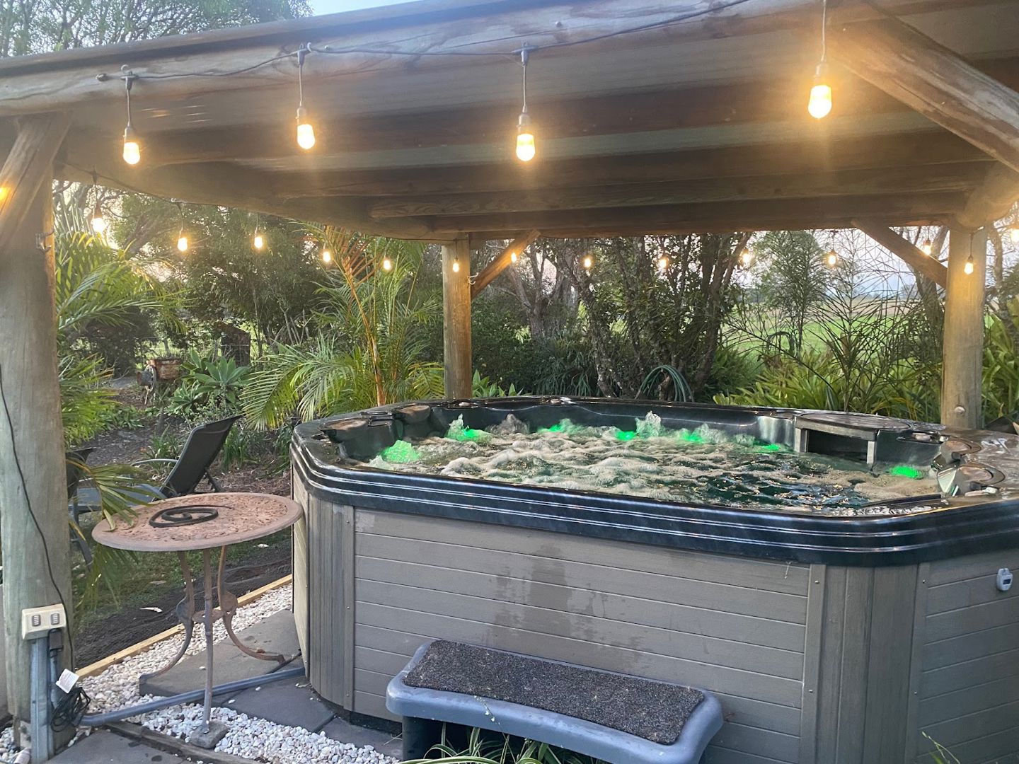 A covered, eight-seater Signature Spa makes for a wonderful, relaxing end of day. The spa has lights and a newly replaced digital control panel and is set amongst lush greenery.