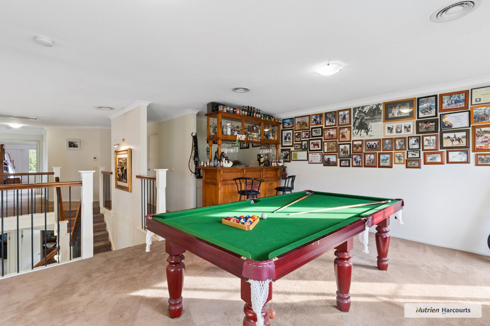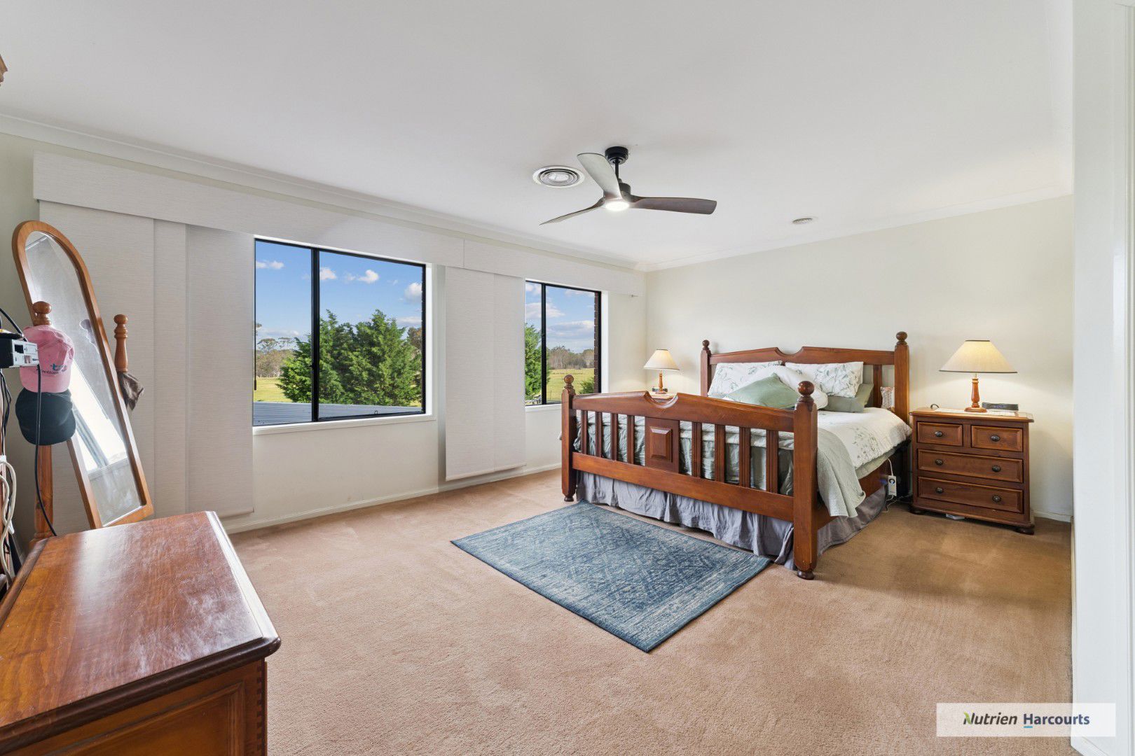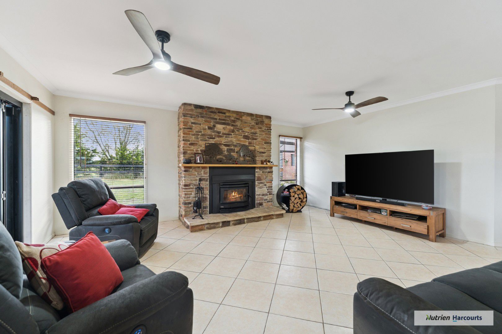 The spacious double-storey residence provides impressive family accommodation, with four robed bedrooms plus a study and multiple living zones designed for comfort and flexibility. A sunlit open-plan living room with wood fire, ceiling fans, and reverse-cycle split system sets the tone for relaxed country living, while the large rumpus or gym room offers extra space for recreation. The main bedroom includes a walk-in robe and a luxurious ensuite with spa bath and double vanity.