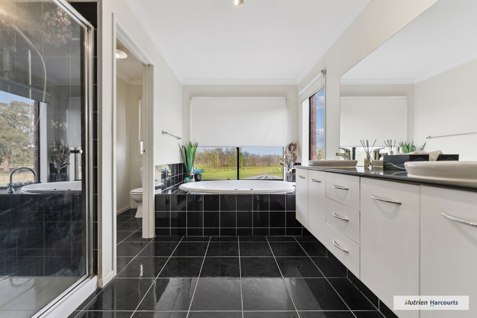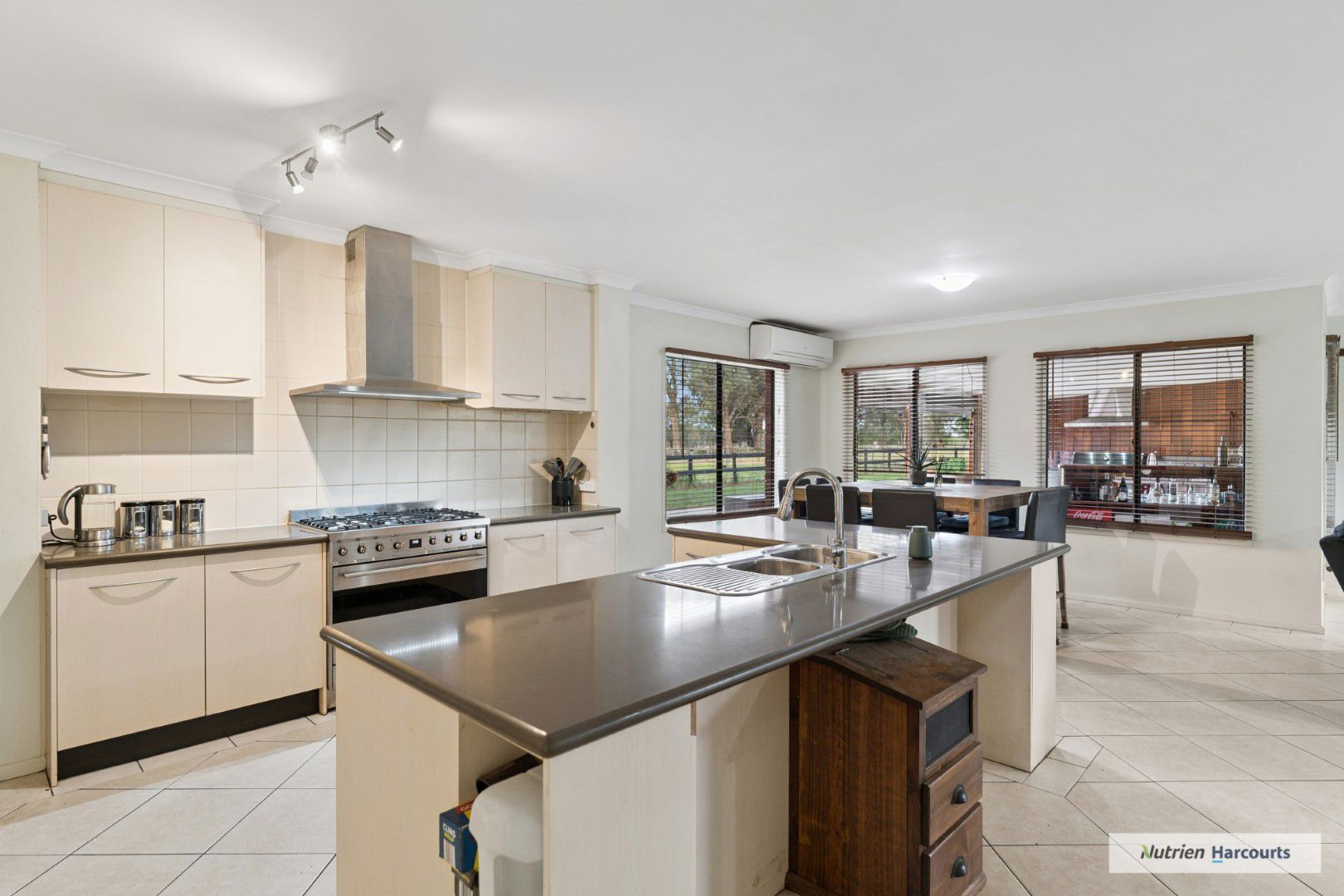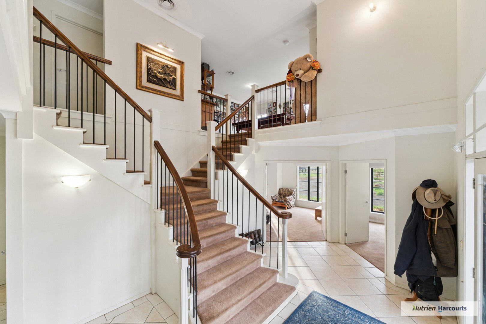 The spacious double-storey residence provides impressive family accommodation, with four robed bedrooms plus a study and multiple living zones designed for comfort and flexibility. A sunlit open-plan living room with wood fire, ceiling fans, and reverse-cycle split system sets the tone for relaxed country living, while the large rumpus or gym room offers extra space for recreation. The main bedroom includes a walk-in robe and a luxurious ensuite with spa bath and double vanity.