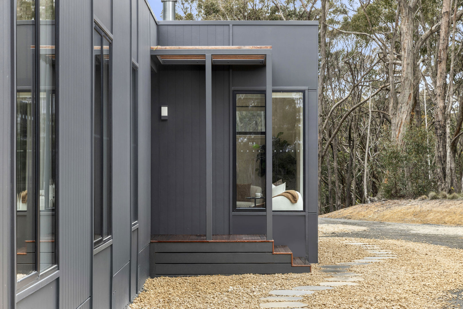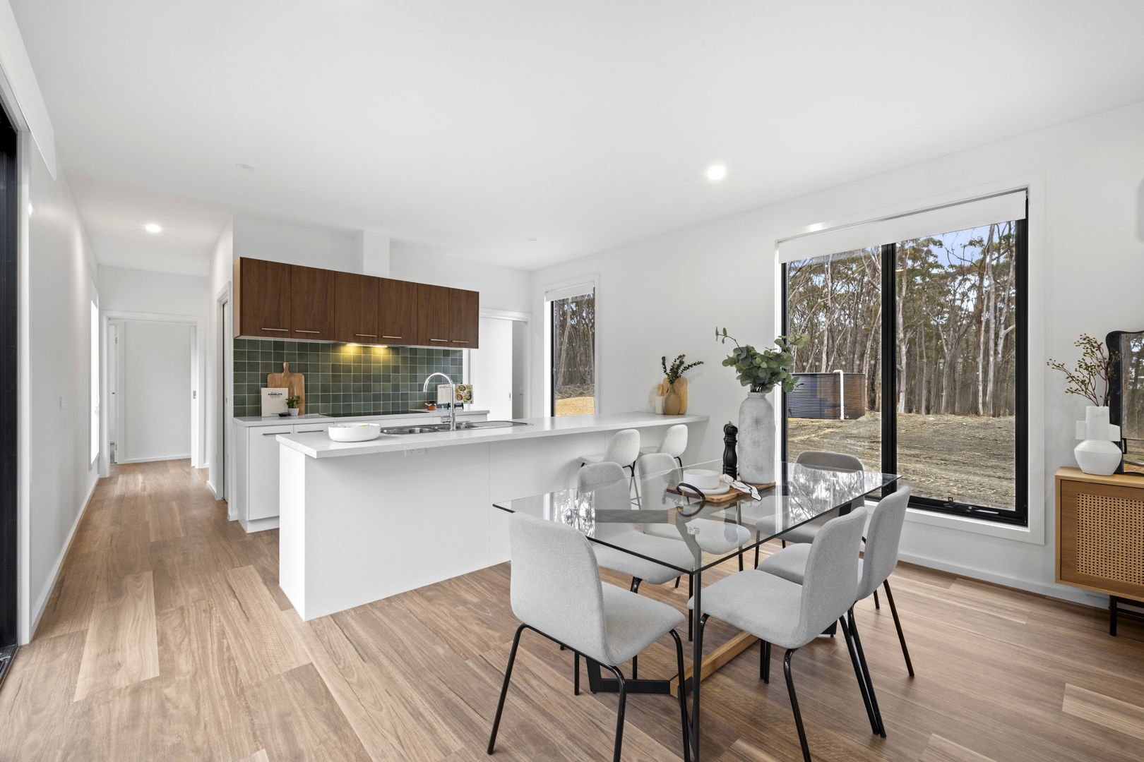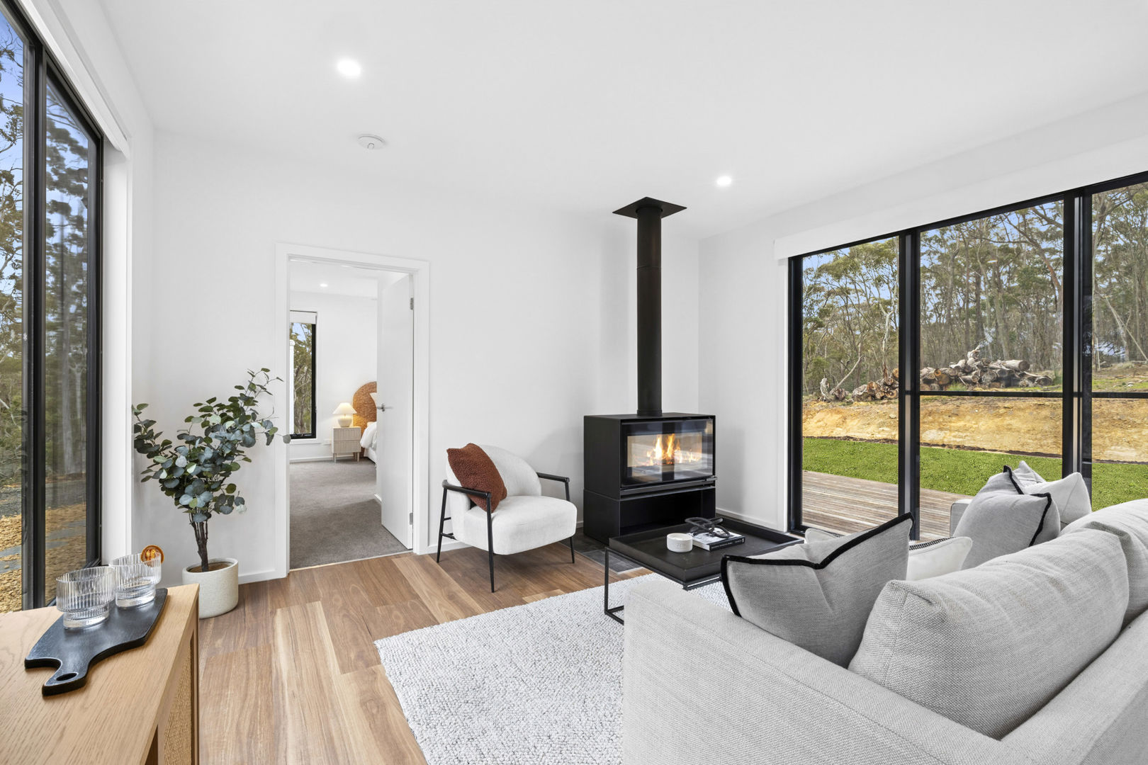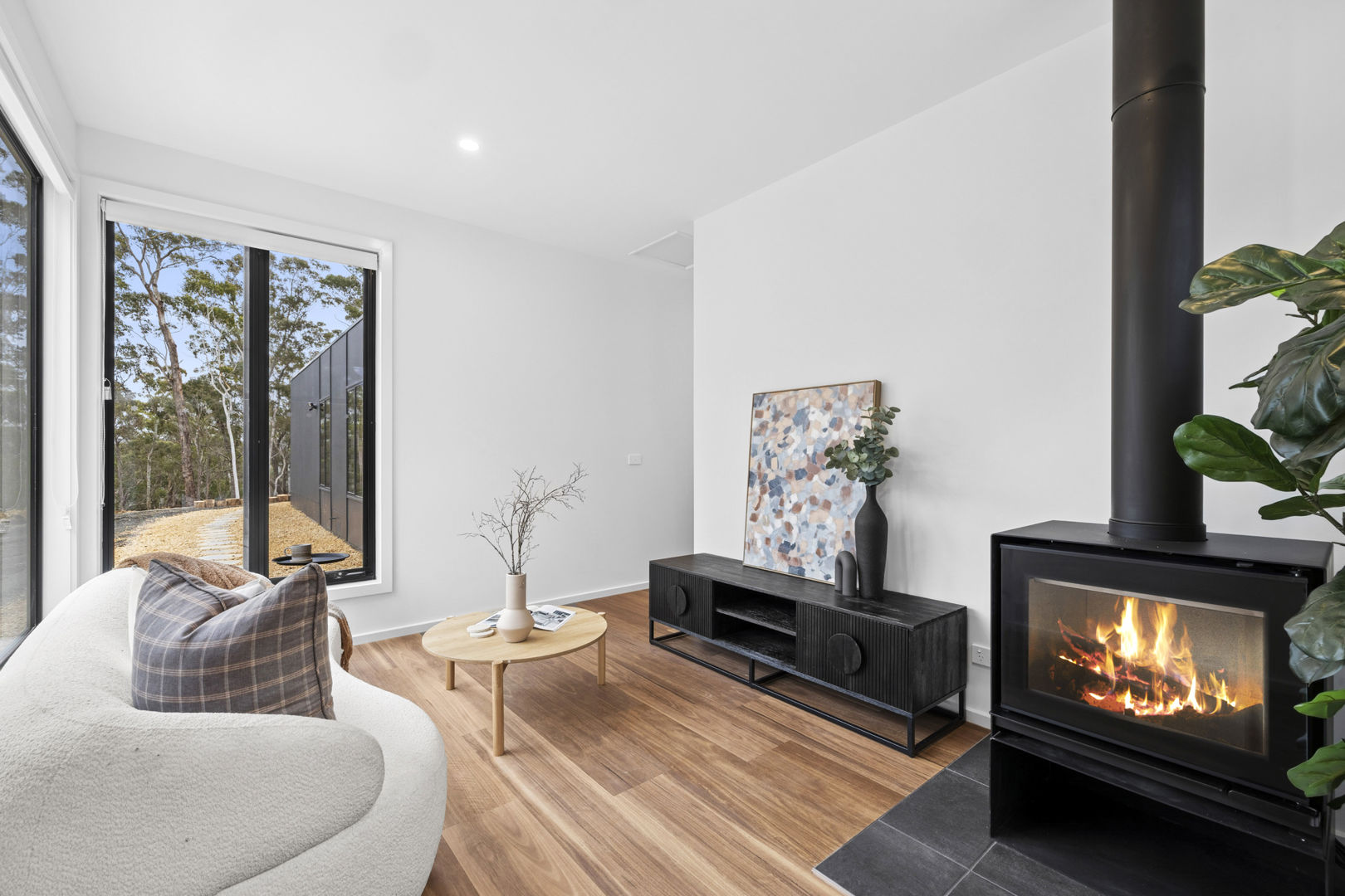 A long, private driveway heightens the sense of seclusion, leading to a striking dark façade that sits quietly against the trees. Step inside and the interiors are awash with natural light. Spotted gum vinyl floors bring warmth beneath your feet, while expansive glass sliding doors frame the forest outlook and open directly to the wide, north-facing deck. It's a living space designed for togetherness, whether it's lazy weekend breakfasts, summer evenings with friends, or fireside gatherings in winter.