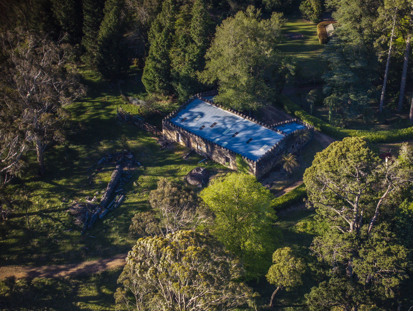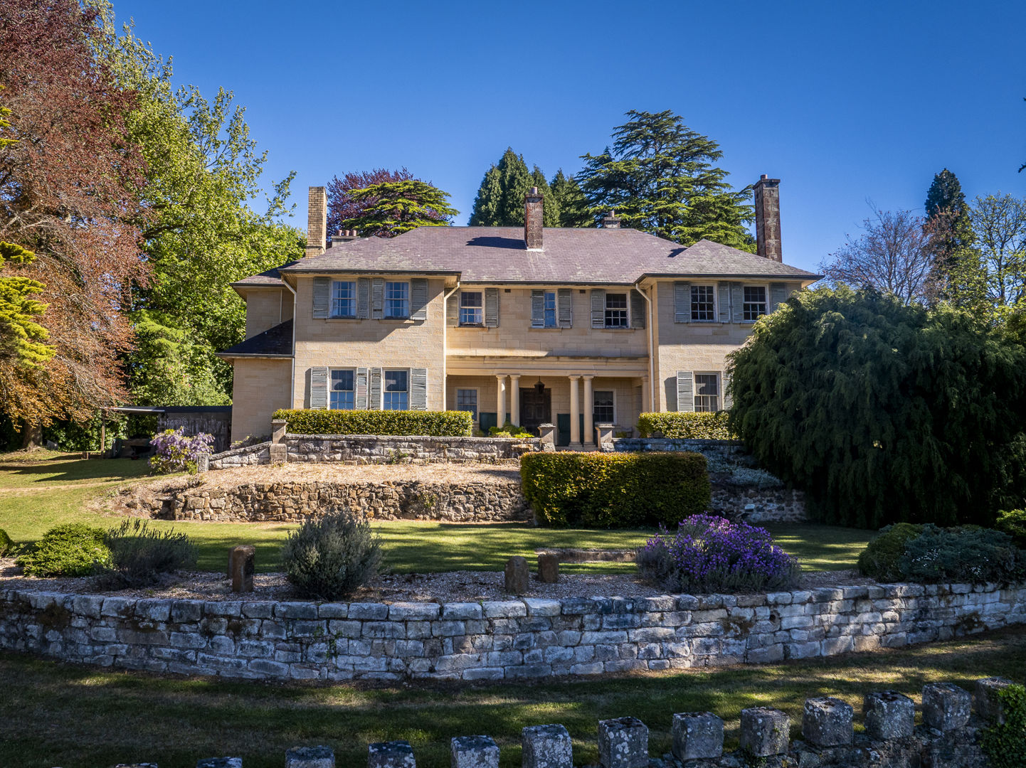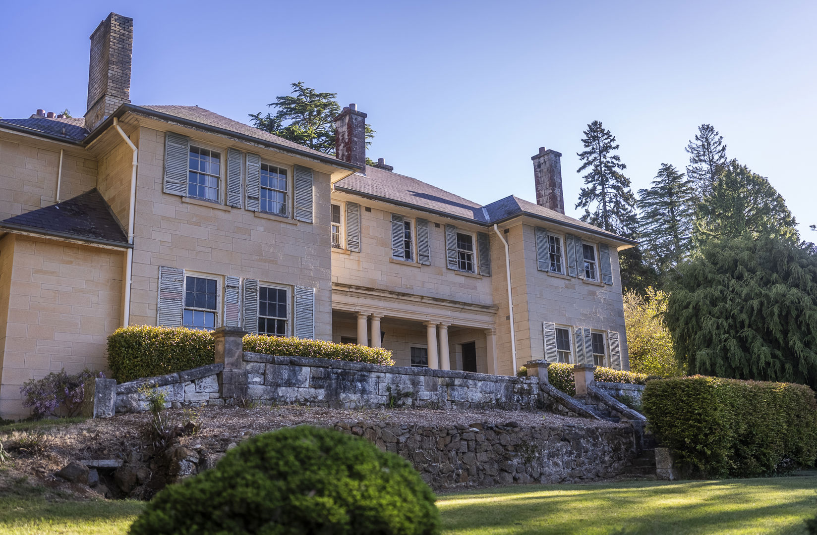 At its heart stands the grand sandstone homestead (1921-1923), designed by renowned architects Joseland & Gilling in the Inter-War Georgian Revival style. Built from locally quarried sandstone by Scottish stonemasons, the residence embodies refined craftsmanship with hand-cut stone, paired Doric columns, and sweeping views over the Blue Mountains and Wollemi National Park.