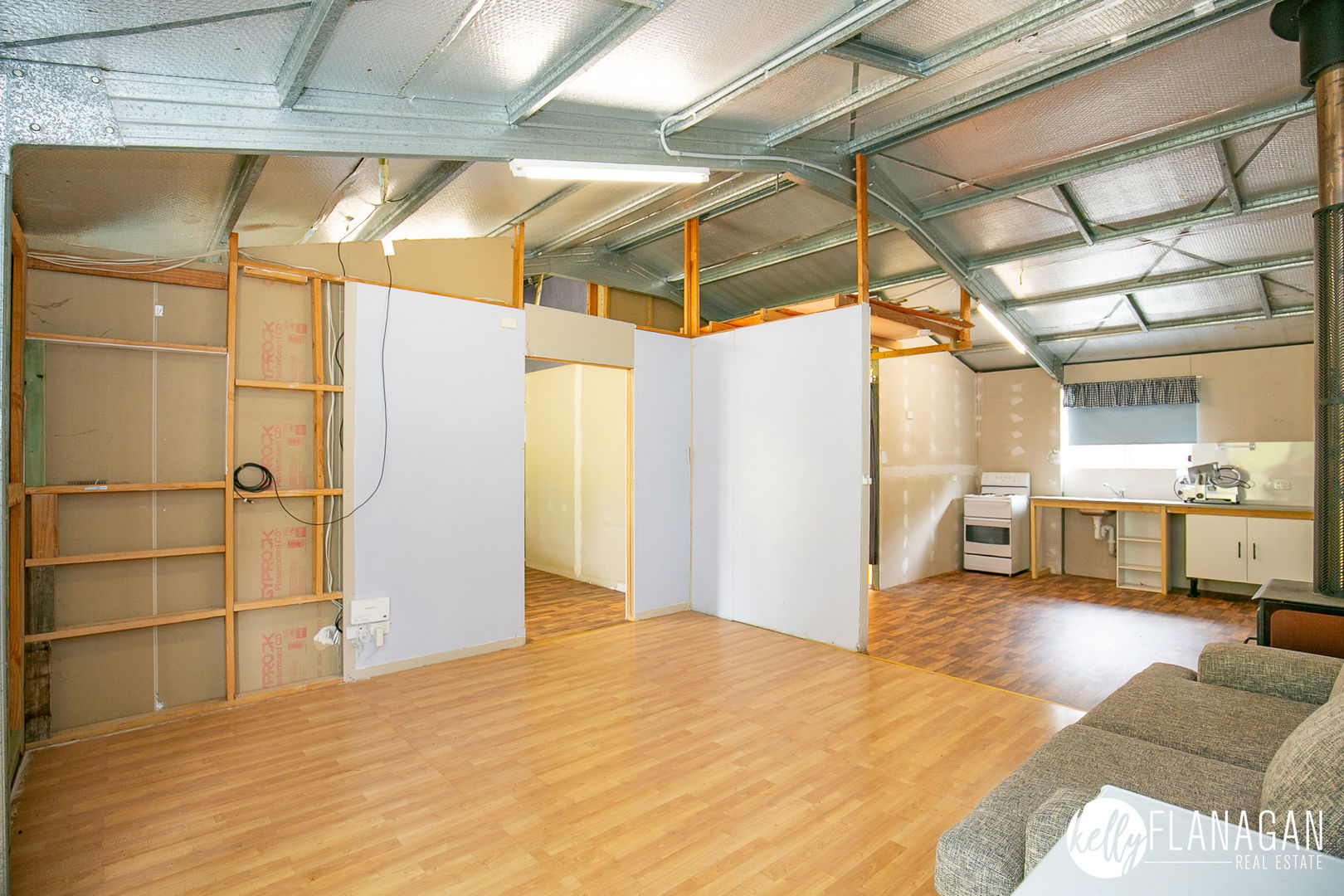 - Self-contained Colorbond shed/cabin (9m x 9m enclosed) + (9m x 2.5m veranda): open-plan living, kitchenette, bathroom, fire place, reverse cycle air conditioning, power, water, NBN satellite