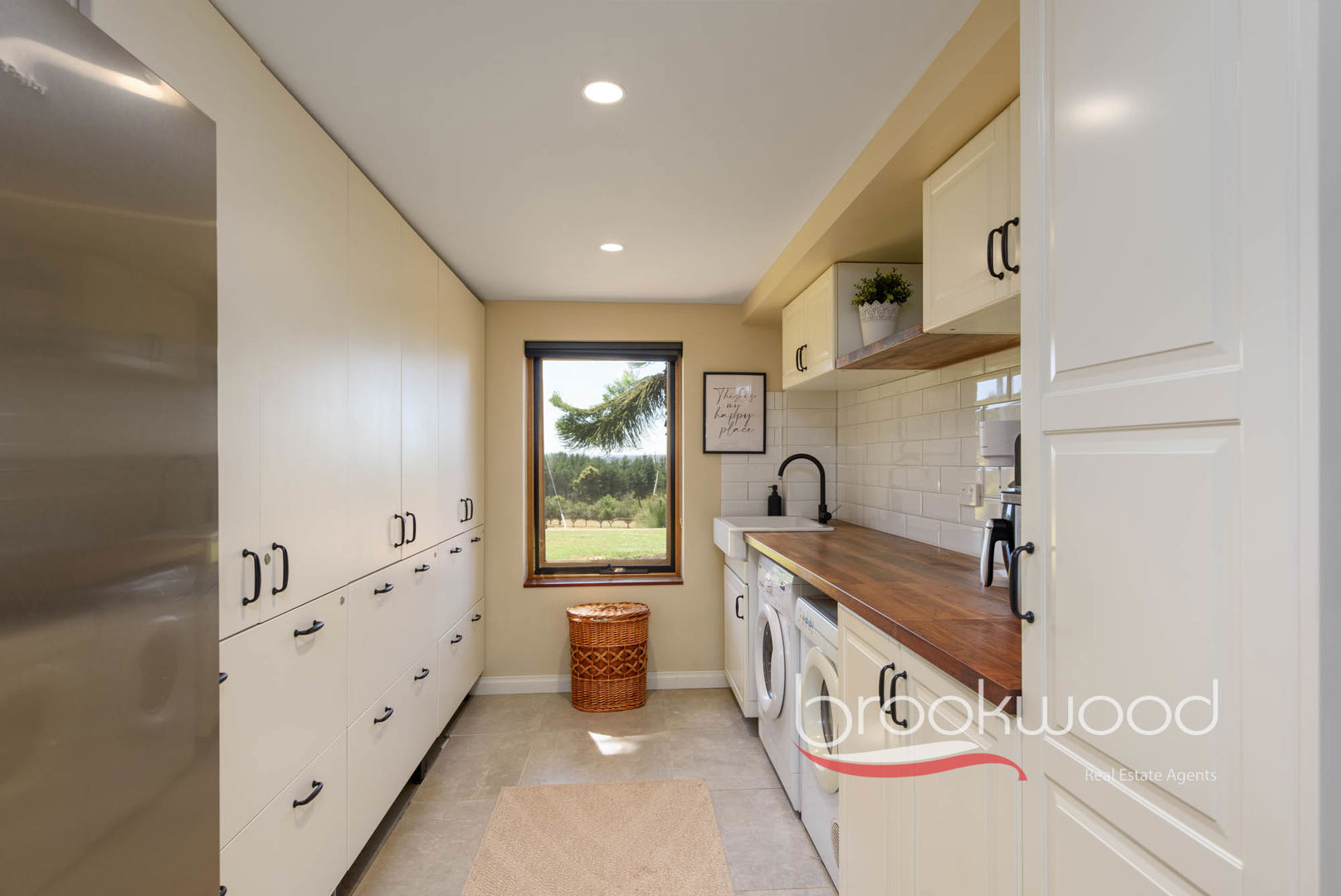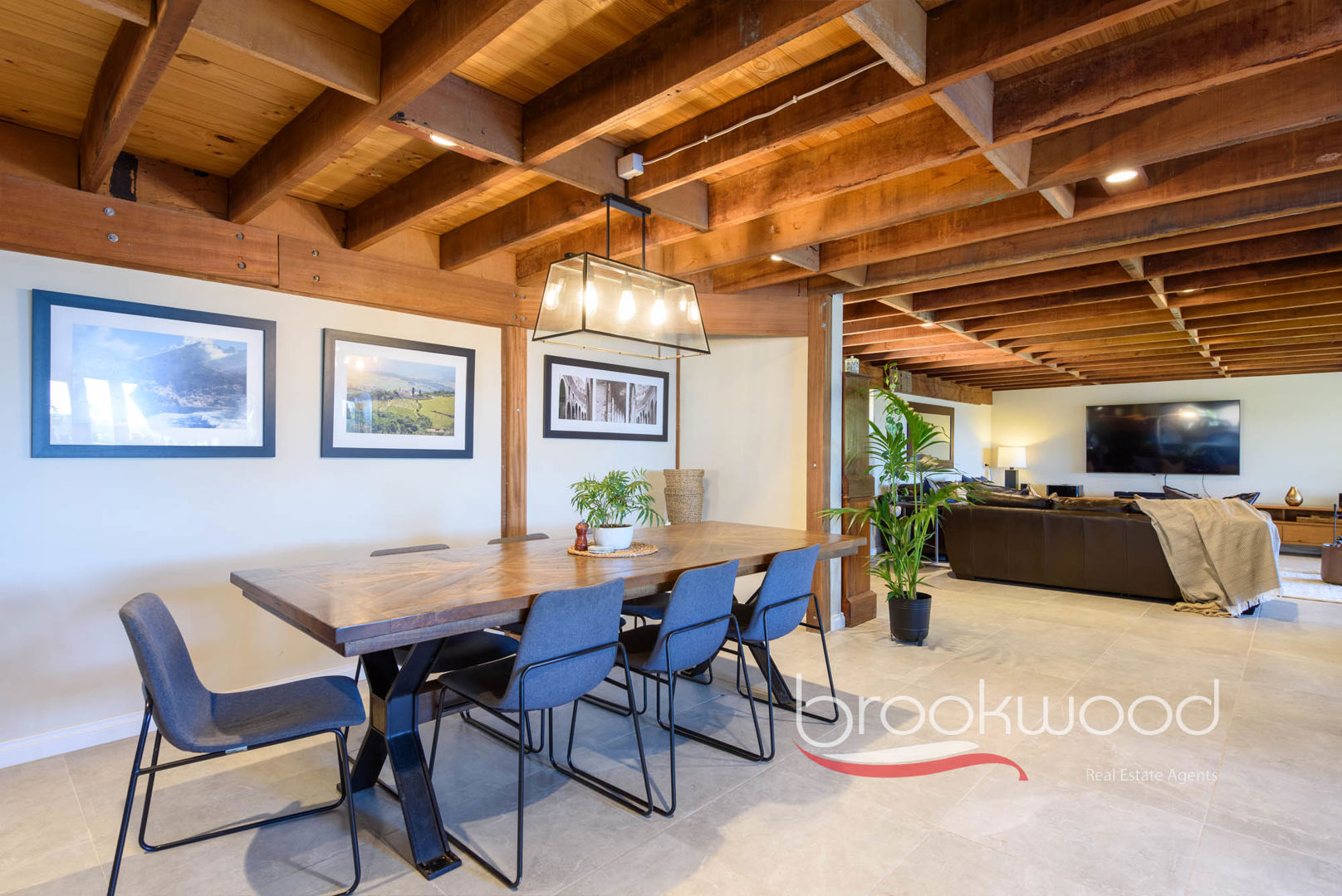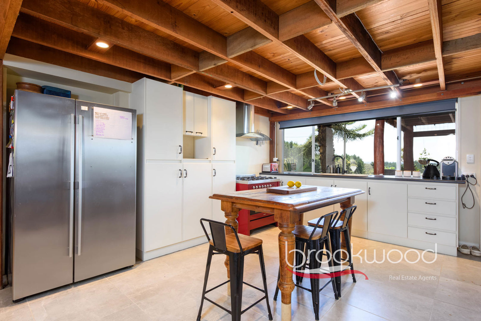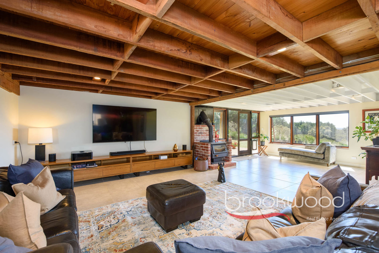 Windows fill the corner kitchen with mesmerising views. The adjoining family room expands generously, accommodating a substantial sofa, large television, and plenty of room for everyone to gather around the slow combustion fireplace – a spot where stories unfold – all bathed in natural light through a picture window that serves as a constantly shifting artwork of sky, land and weather. A sliding door opens to a shaded, north-facing verandah where grass trees sway in valley breezes, their fronds catching light like dancers.
