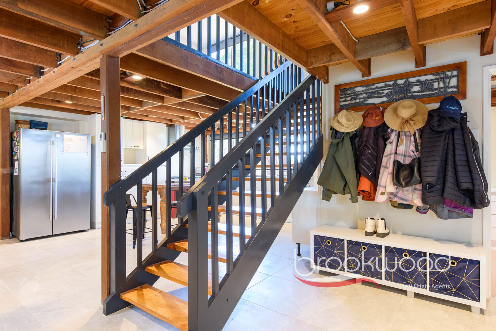 The principal home, a two-storey Colorbond structure, embodies a family-focused design that marries rustic charm with contemporary ease. Its soft charcoal exterior contrasts elegantly with timber door and window frames, while exposed joists are a subtle nod to the rural context. The ground floor unfolds as an integrated kitchen, meals and family space designed for the beautiful chaos of family life. A snug corner invites quiet moments, a clever scullery and laundry tuck away daily essentials and expand practical capacity while keeping living zones uncluttered – the kind of planning that transforms daily routine into effortless flow.