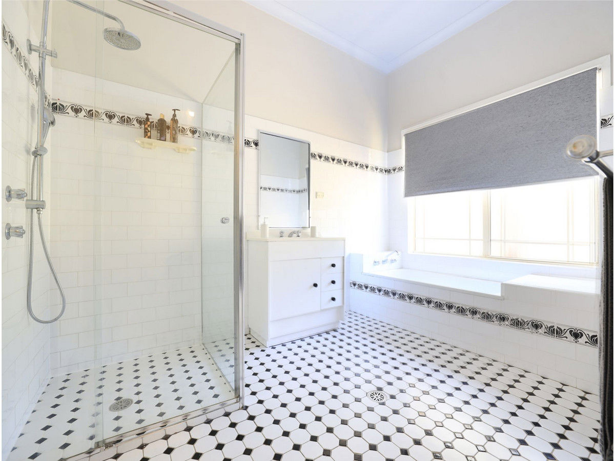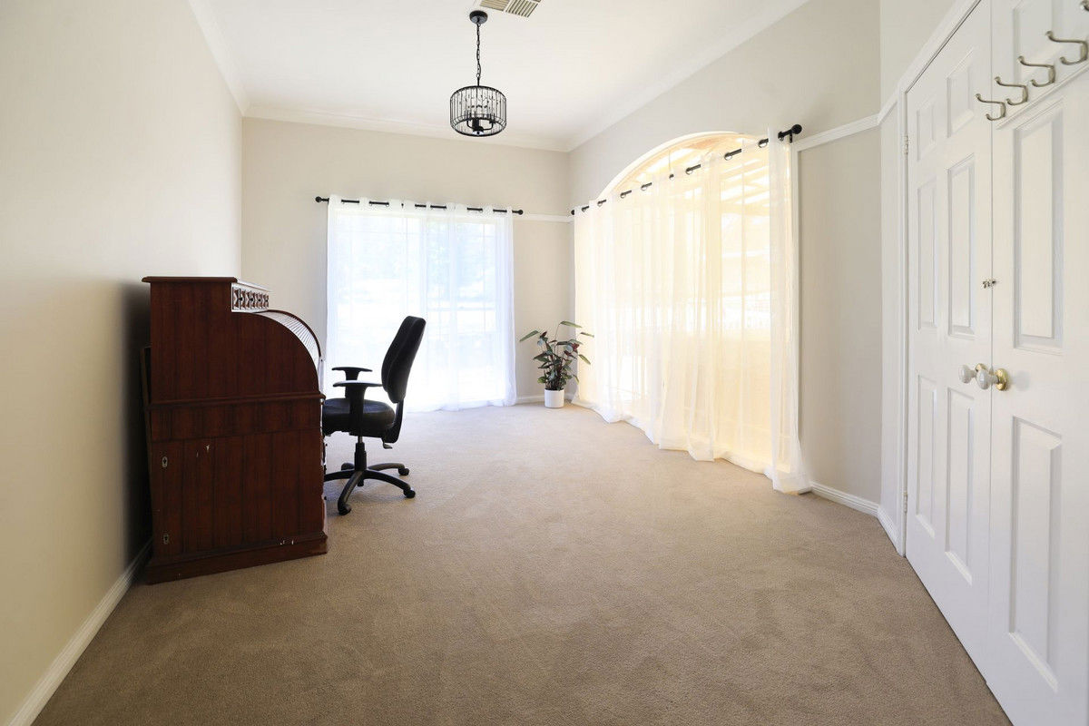 At this end of the home is the sunken lounge room with slow combustion heater and the parents' retreat. This has a study, walk-in robe and stylish ensuite with bath in addition to the generous bedroom.