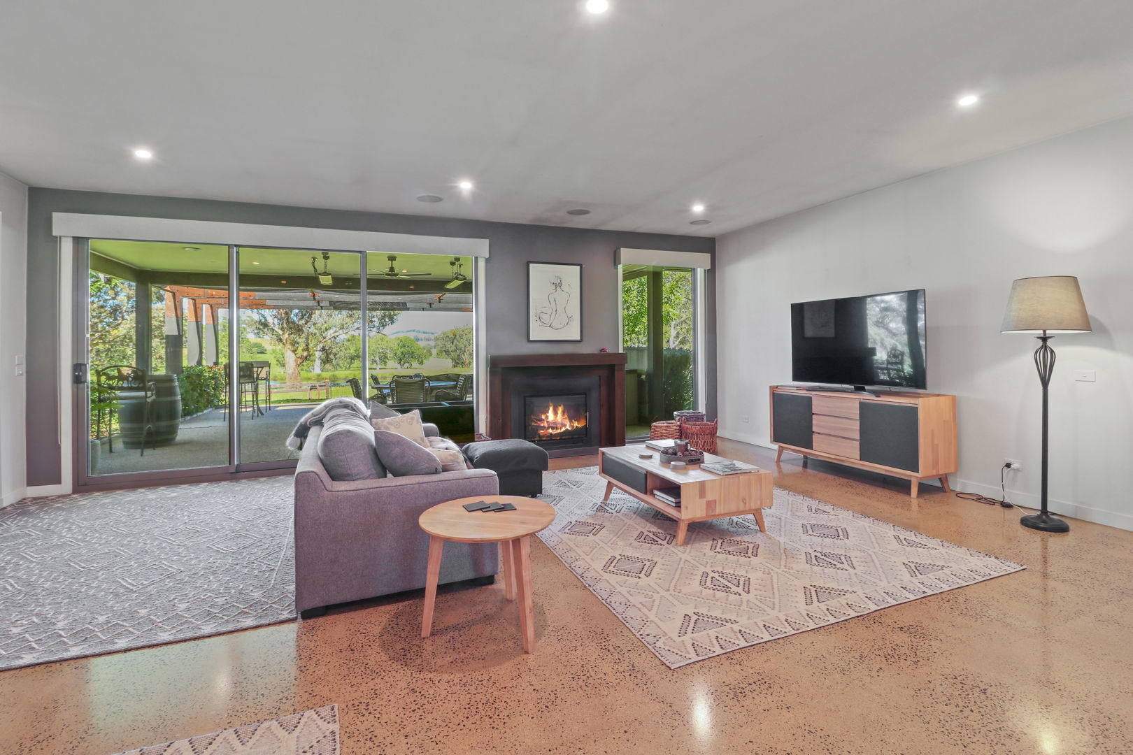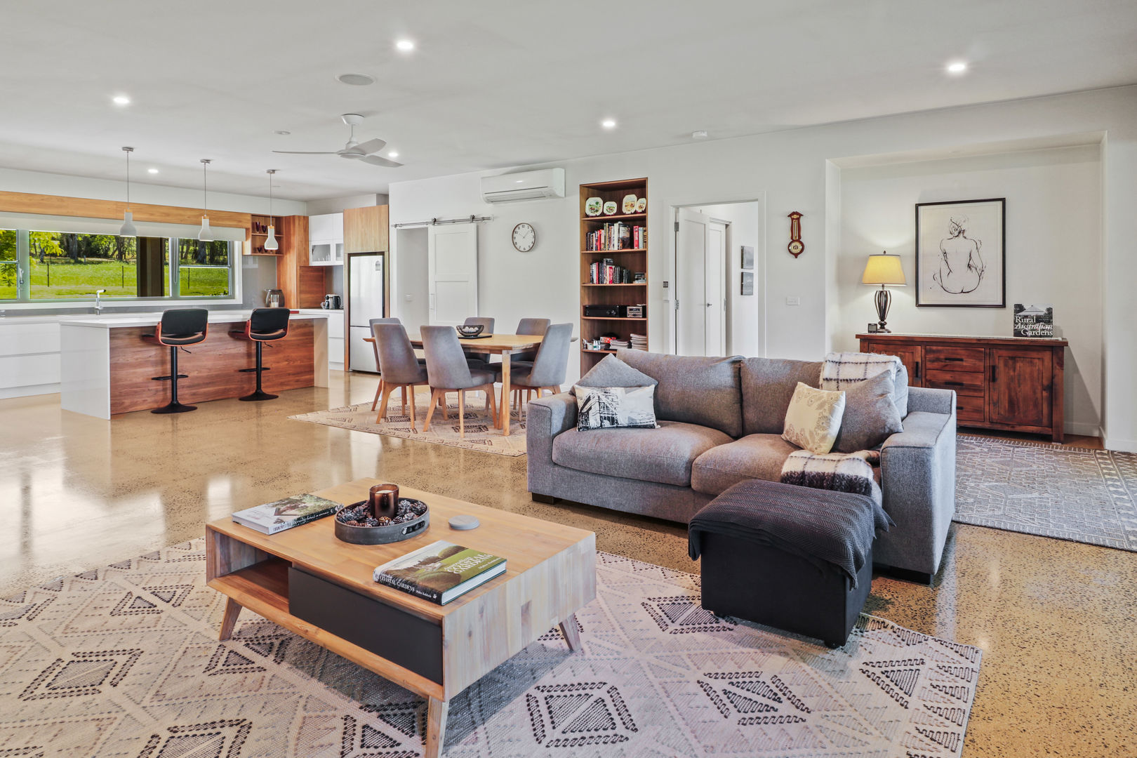 • Open plan living/dining with fireplace and rural views.