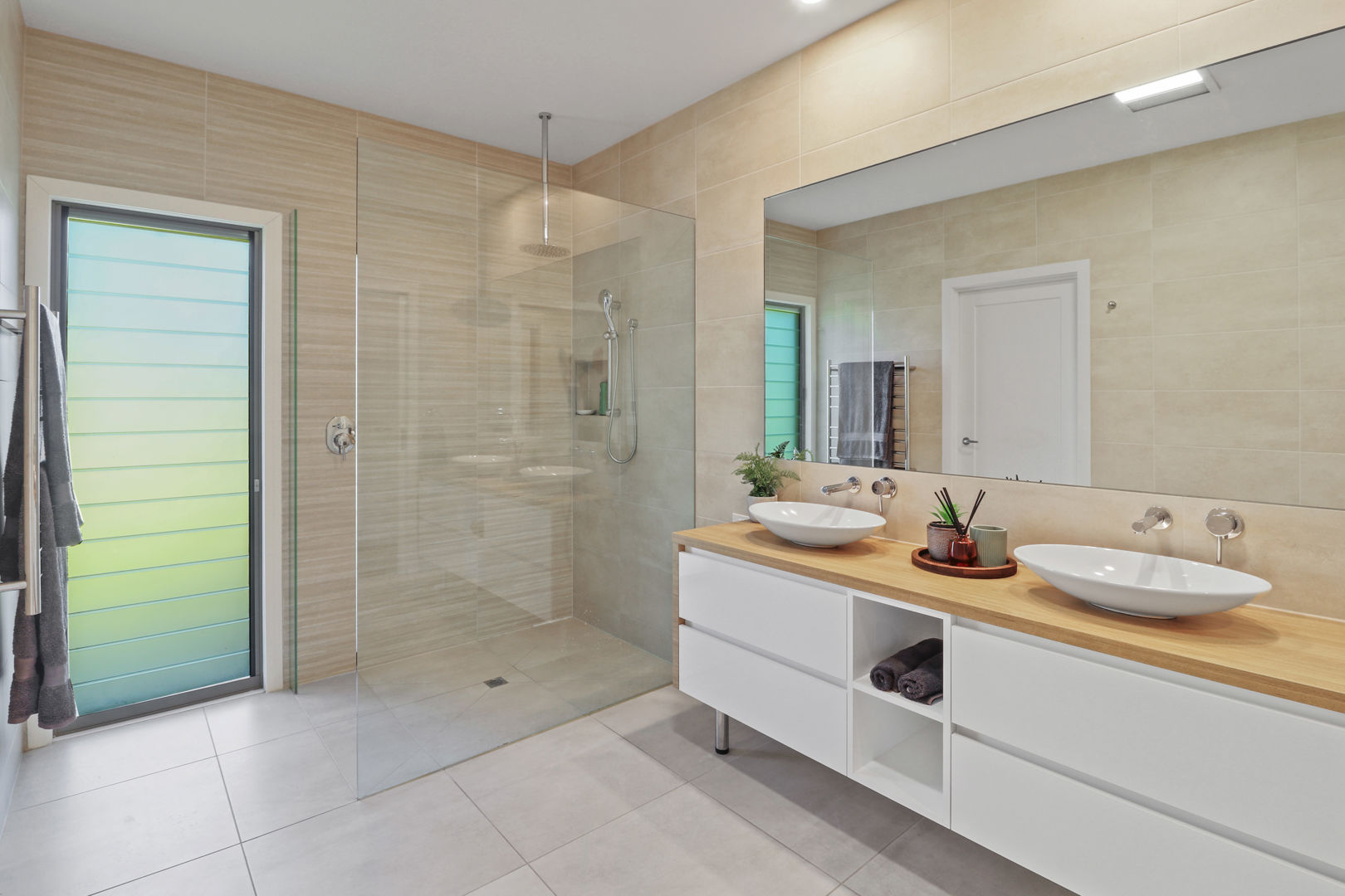 • Oversized laundry with custom cabinetry and underfloor heating.