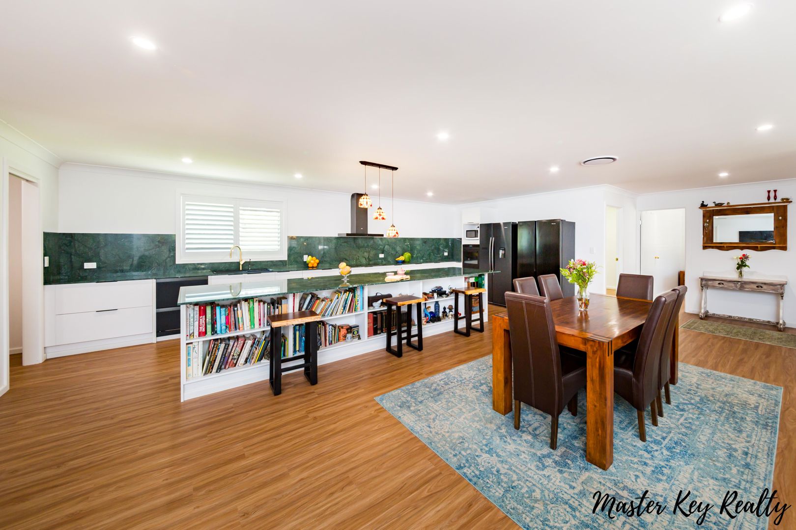 The main residence is designed for effortless indoor-outdoor flow, centring around a elegant open-plan living, dining and kitchen zone. Plantation shutters, ducted air conditioning, ceiling fans, wide hallway and multiple sliding doors to the north-east facing veranda invite outdoor entertaining and quiet moments overlooking the grounds.