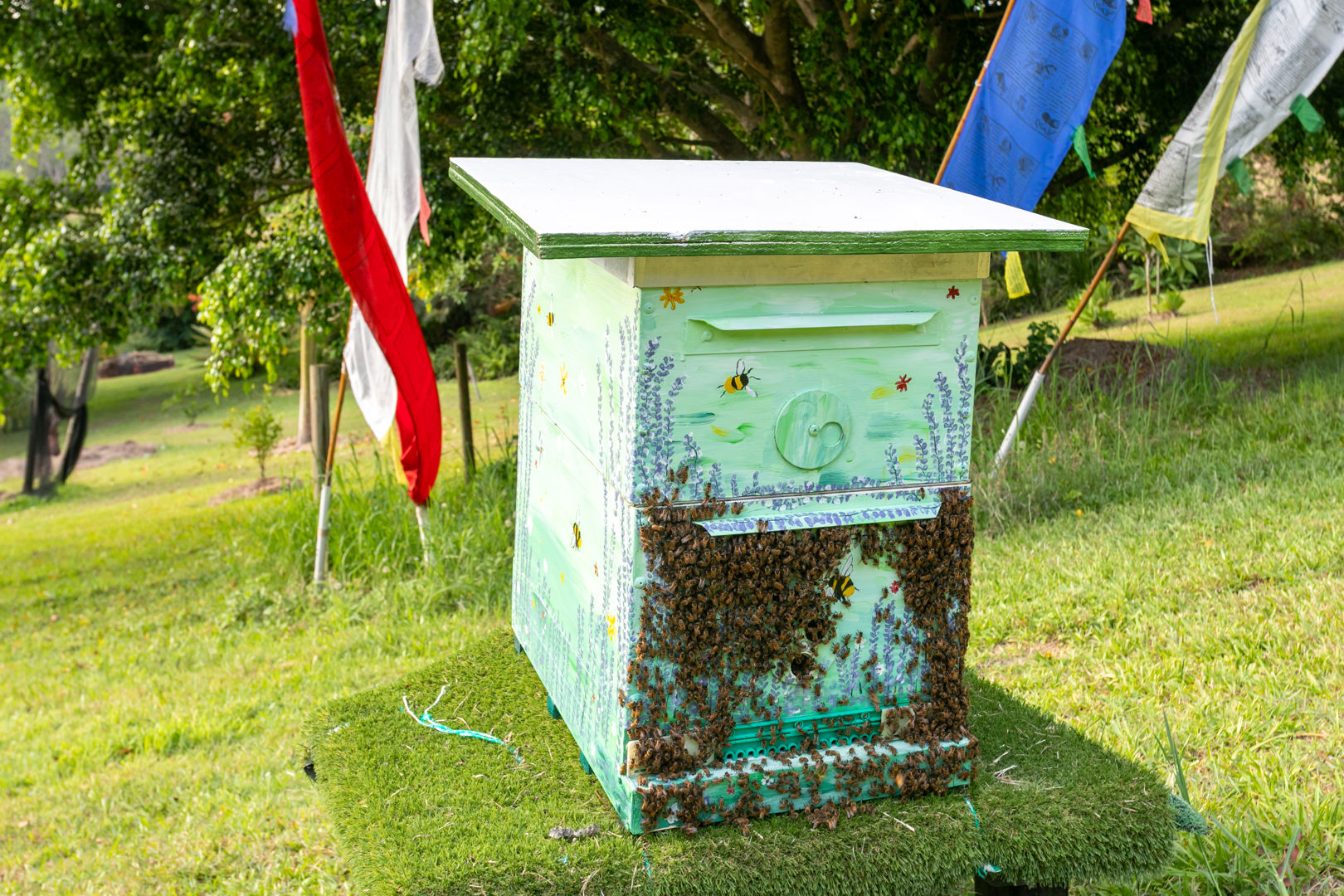 Outdoors, manicured lawns frame established fruit trees, organic vegetable gardens and improved chemical-free soils. Beehives support natural pollination while providing a fresh supply of honey, reinforcing the property's commitment to sustainable living and homegrown abundance.
