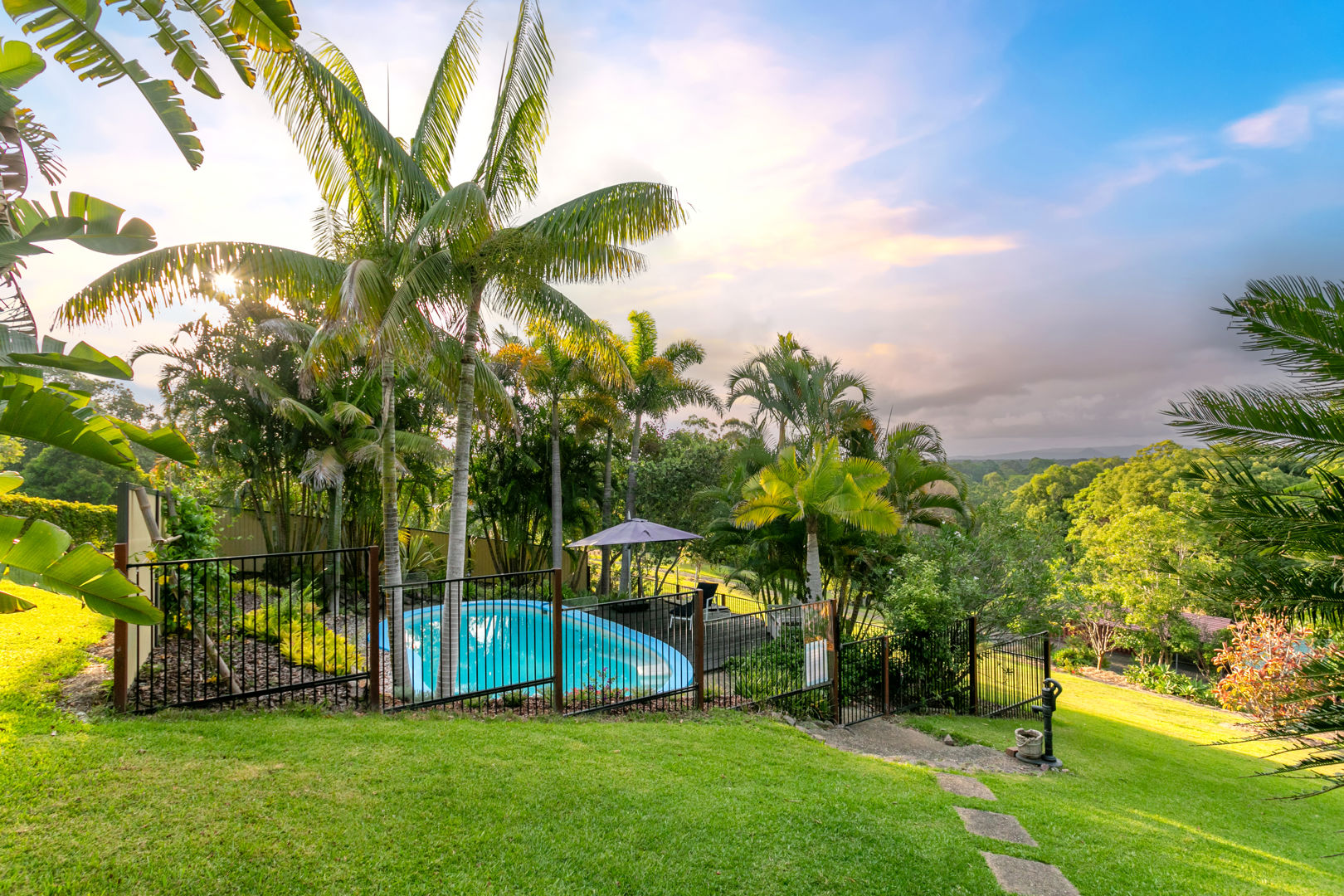 Imagine waking to the gentle chorus of native birds, stepping outside to sweeping views over lush tropical gardens that roll across green hills to distant mountain ranges. From the elevated veranda, golden sunsets melt into the Noosa Hinterland skyline - a daily ritual best enjoyed in stillness and privacy.