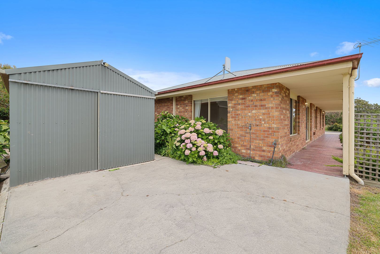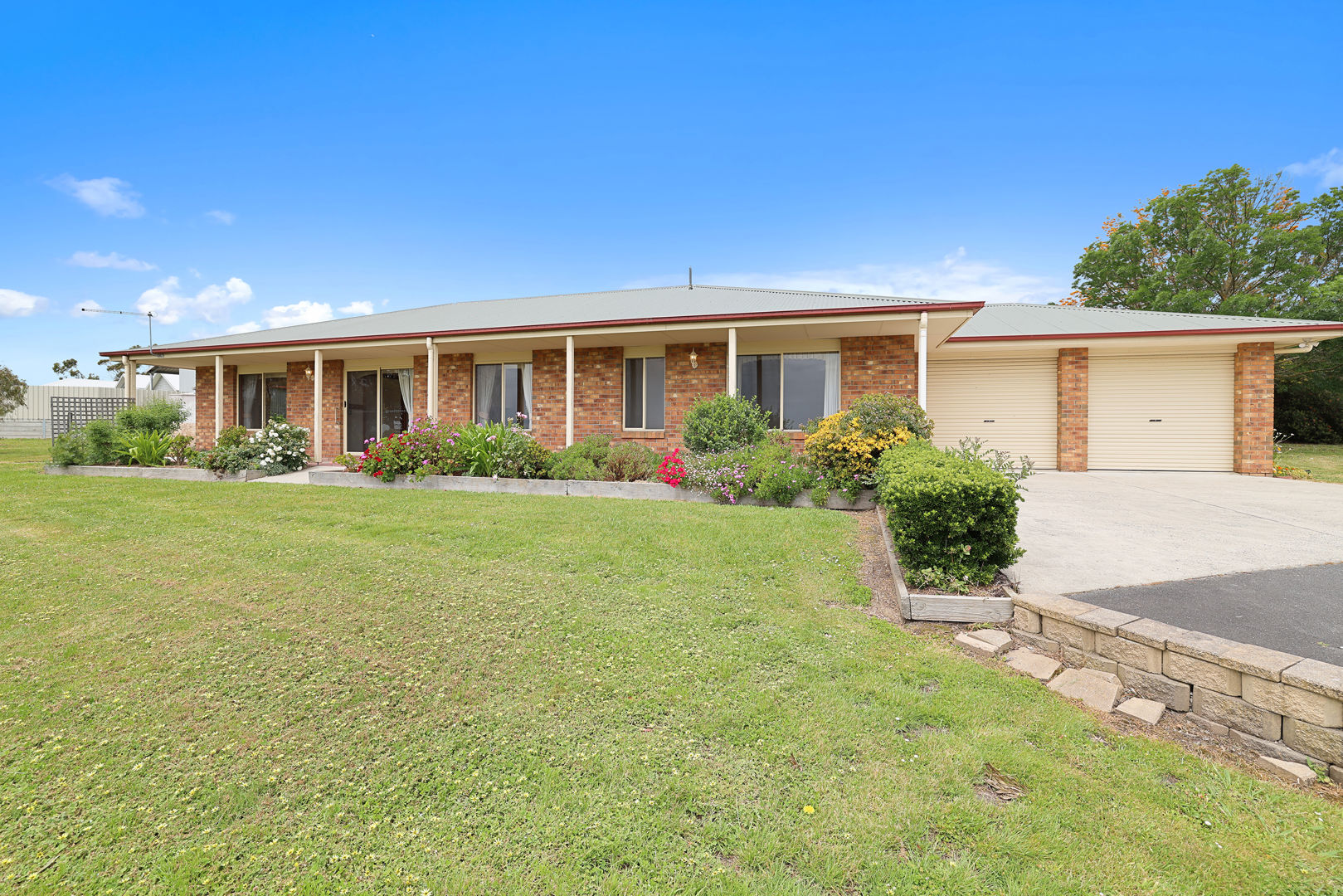 Outside, established gardens with fruit trees surround the home, enhancing the sense of privacy and connection to nature. A double garage and shed provide ample storage for vehicles, tools or equipment.