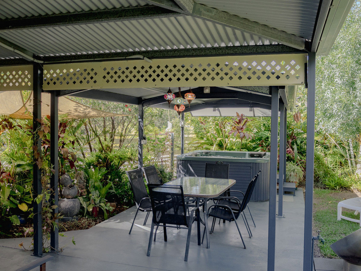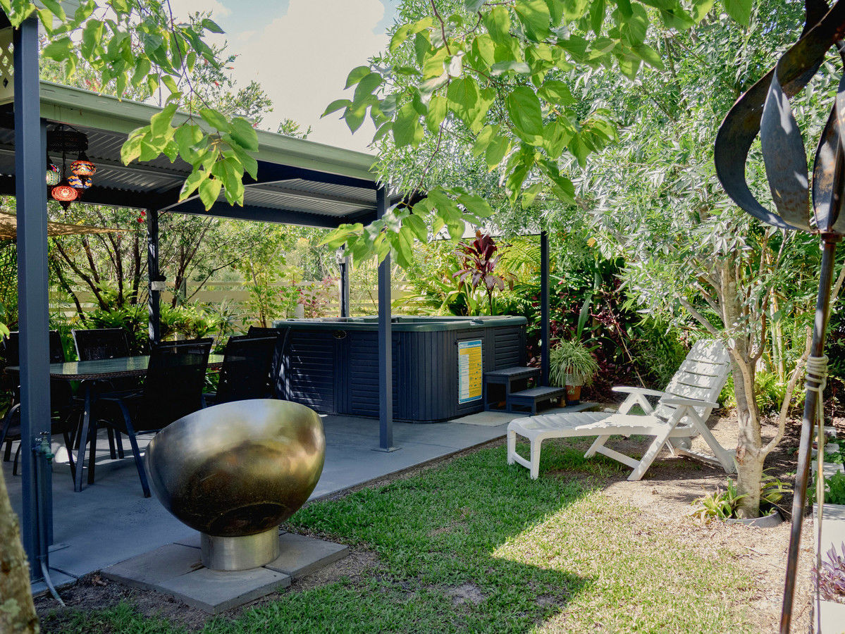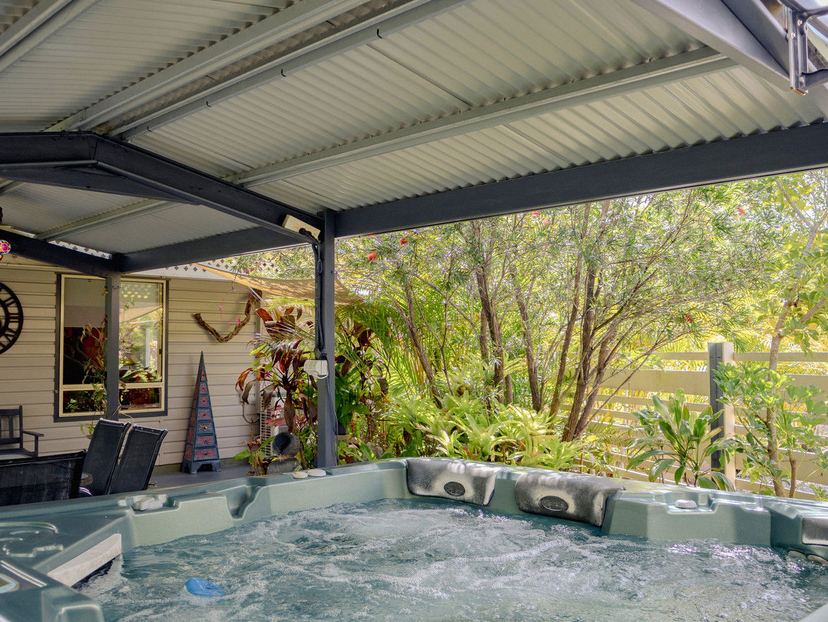 Step outside to a sheltered entertaining area framed by vibrant subtropical foliage. The five-person spa offers the perfect place to cool off in summer or unwind on crisp winter evenings, creating a private outdoor retreat that feels like your own jungle oasis.