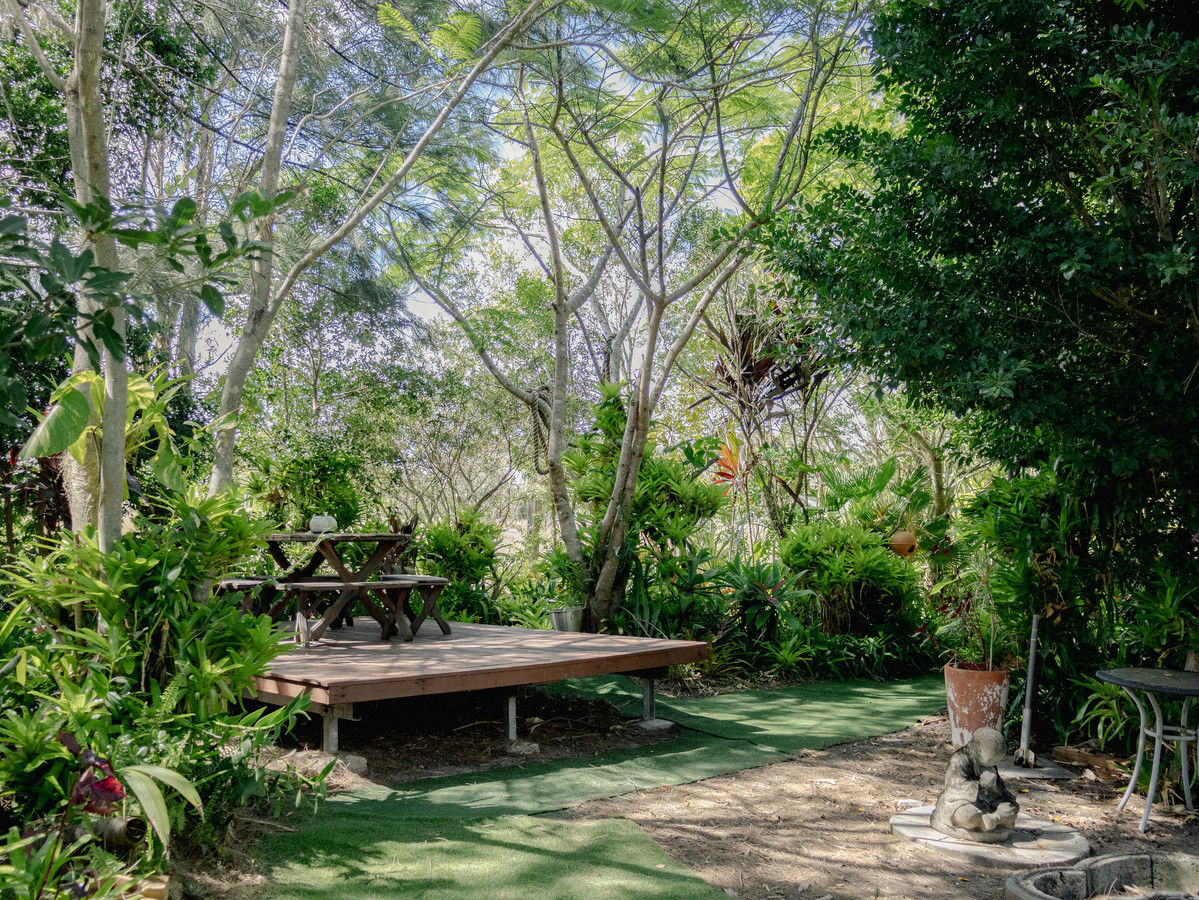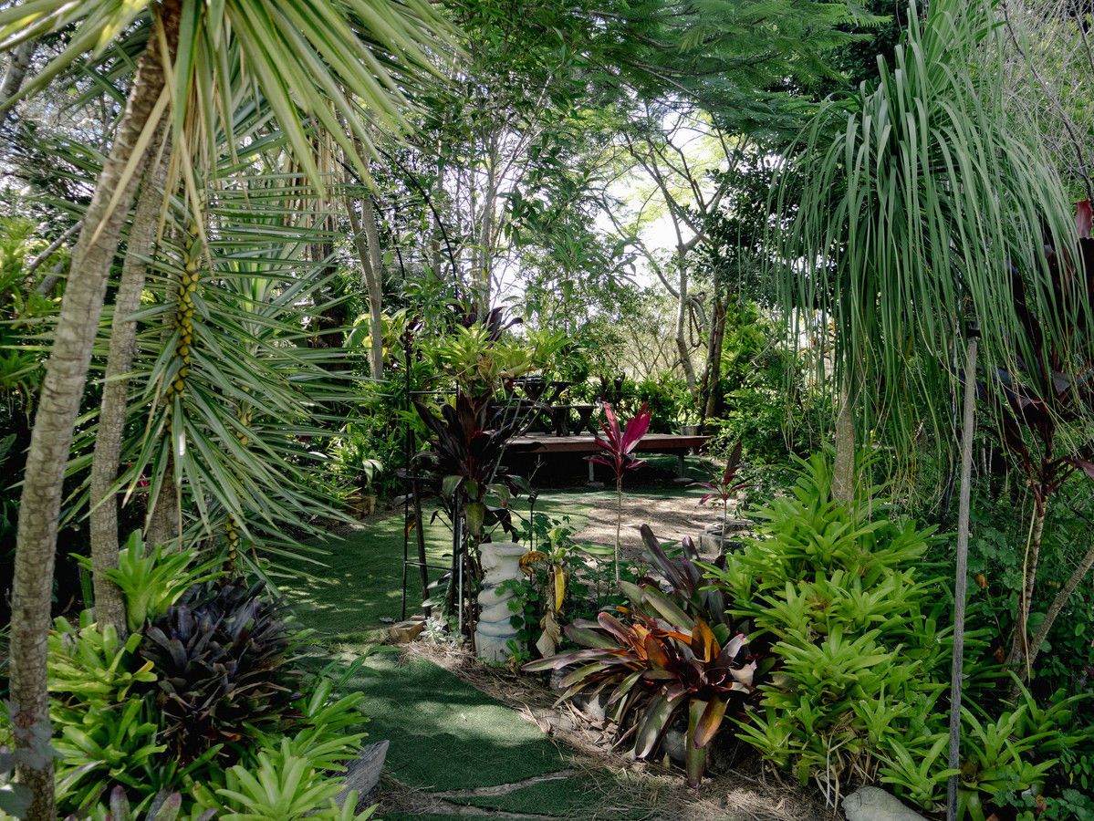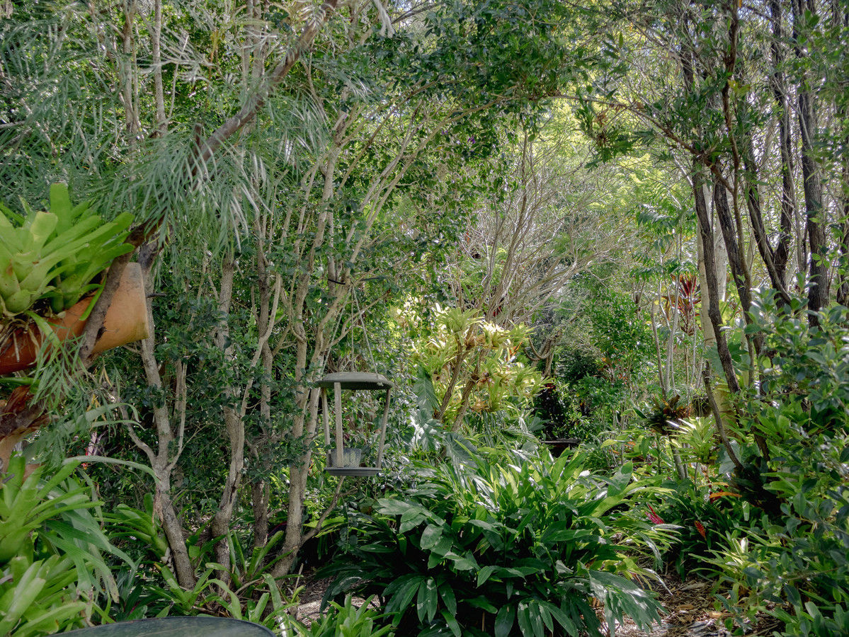 Step outside to a sheltered entertaining area framed by vibrant subtropical foliage. The five-person spa offers the perfect place to cool off in summer or unwind on crisp winter evenings, creating a private outdoor retreat that feels like your own jungle oasis.