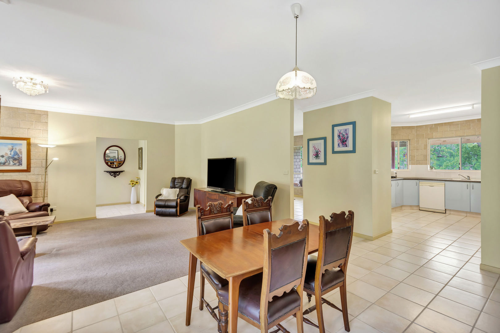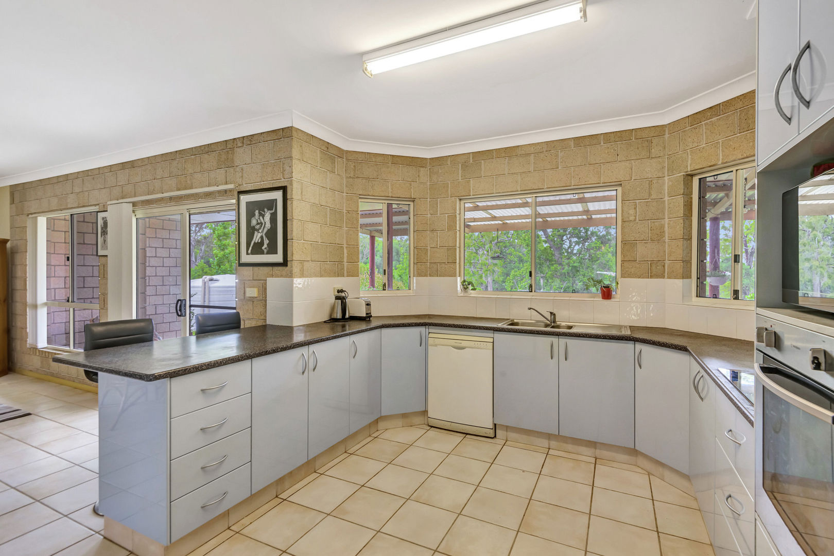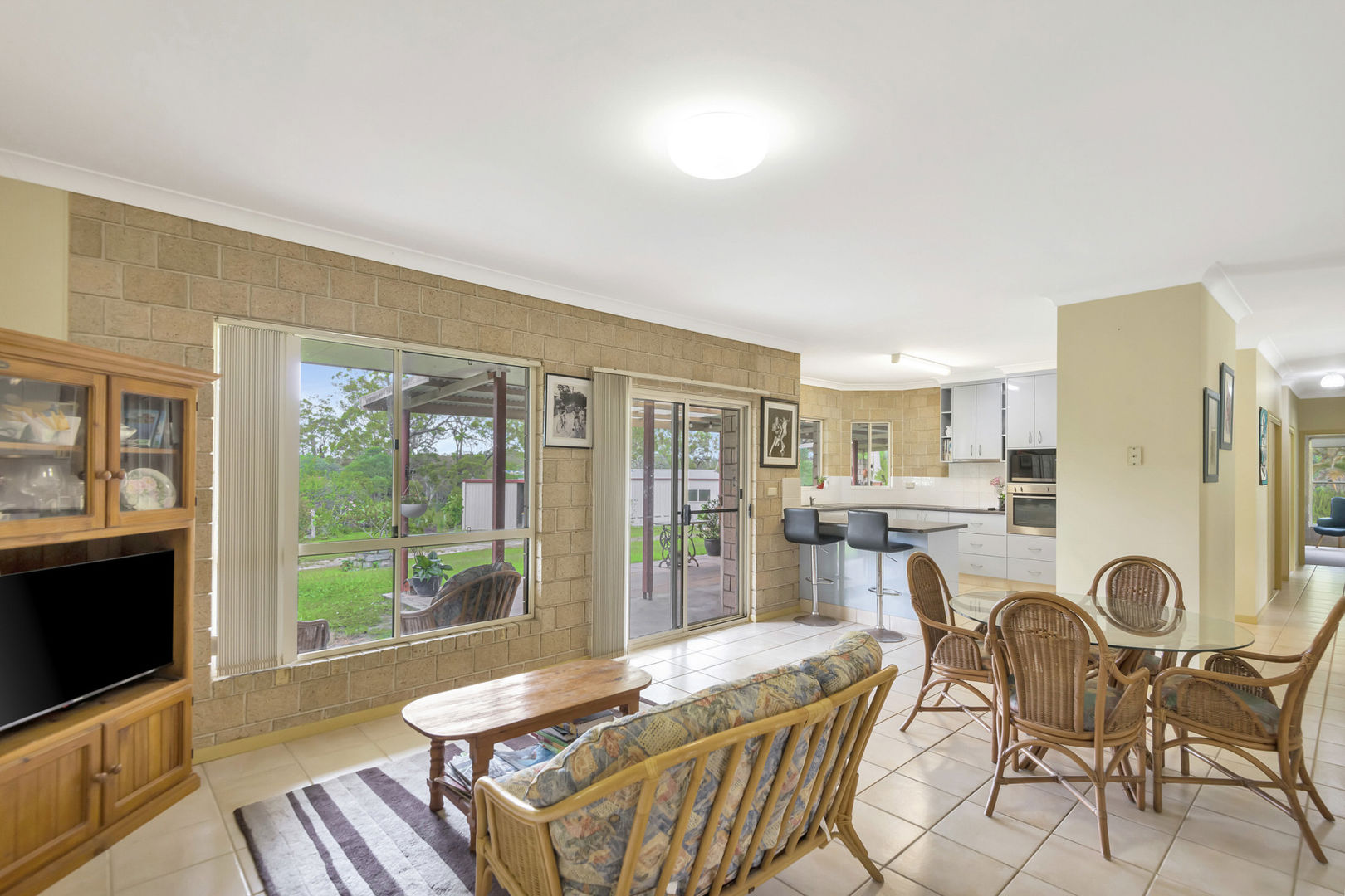 - Open plan kitchen, dining and lounge with air conditioner