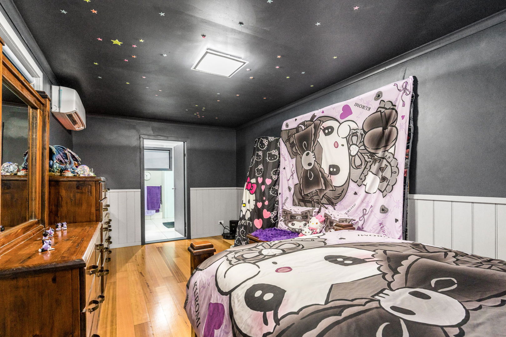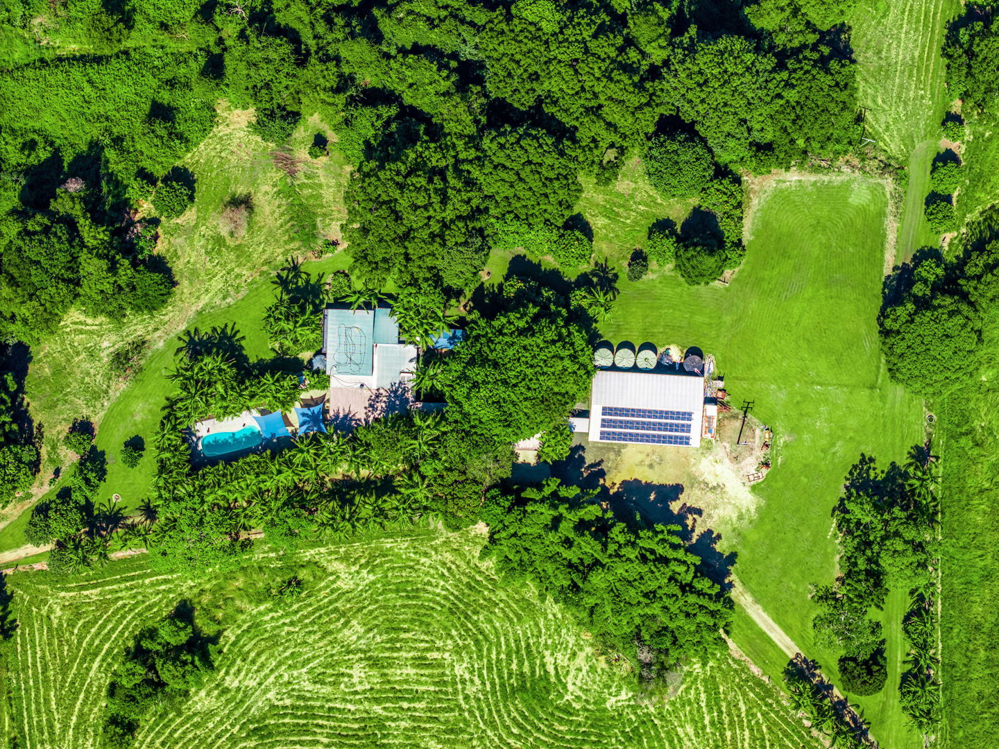 The delightful main dwelling is at the end of a sweeping treelined driveway and largely hidden from the driveway’s view. As you walk into the dwelling through paths and arbours you are met with a resort-style split-level 5-bedroom 3- bathroom home, a gorgeous heated swimming pool and some wonderful surprises. This large family home with mains power has lovely timber features, an open kitchen/dining/living room with towering ceilings, and there’s an array of living spaces inside and out. The extensive landscaping is a feature. Every room is air conditioned which is serviced by an enormous 14kw grid-feed solar system. This home not only can house a large number of occupants, but it can also house their vehicles adequately with accommodation for 10 vehicles (8 carports and 2 machinery ports).
