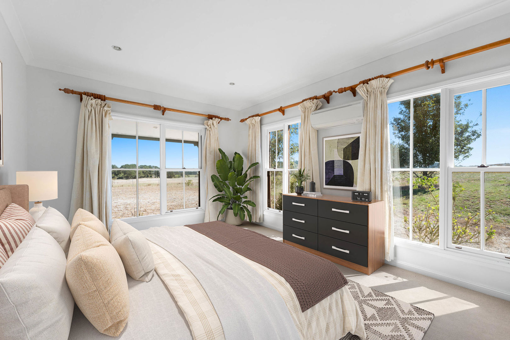 At the heart of the home, the large family area is warmed by a woodburning fireplace, with a split system providing heating and cooling for year-round comfort. Generous windows draw in natural light and frame picturesque views across green pastures, creating a space that feels both open and grounded.