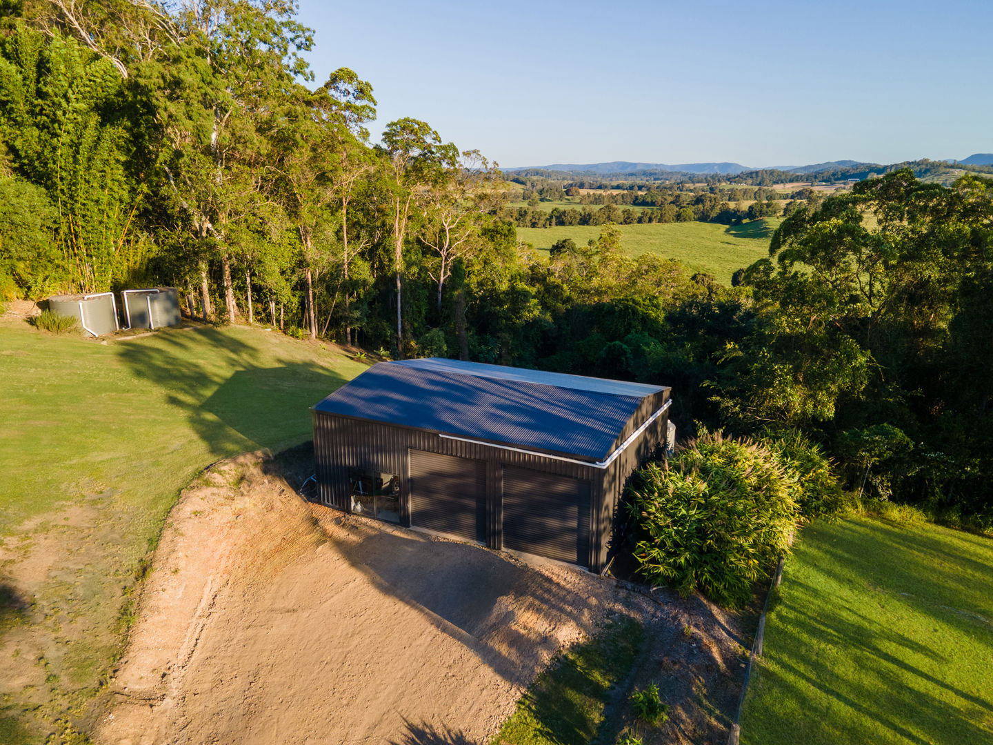 Infrastructure on the property includes farm-style entry gate, partial fencing, new 12mx9m powered colorbond shed, 3 x 5000g rainwater tanks (2 for house, 1 for river), 2 x smaller tanks for shed, garden shed, and chicken coop.