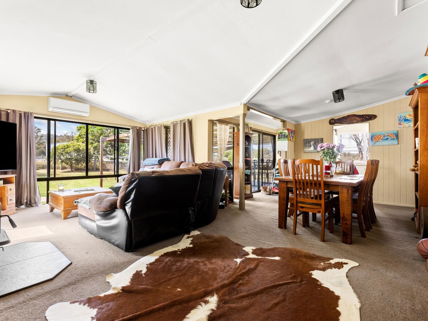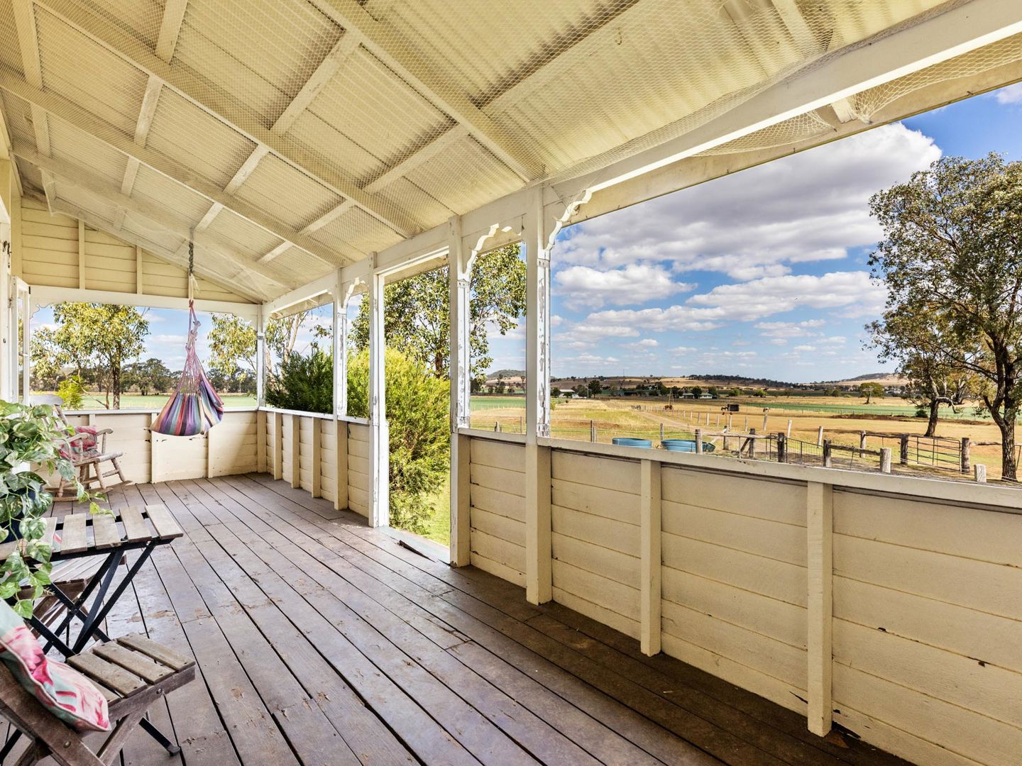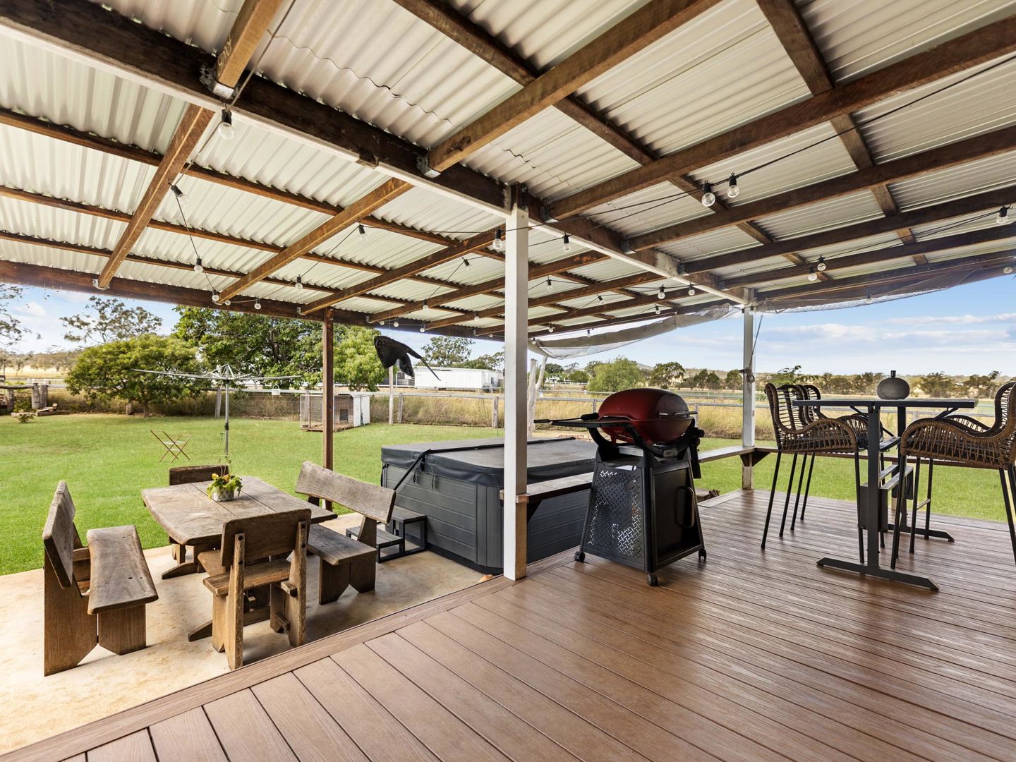 Then there's the back deck - and this is where "Cuttamere" really delivers. A generous covered entertainer with composite decking, festoon lighting, exposed timber rafters, and rustic bench seating, all looking out across the paddocks as the sun sets over the Downs. This space has been genuinely lived in and loved.