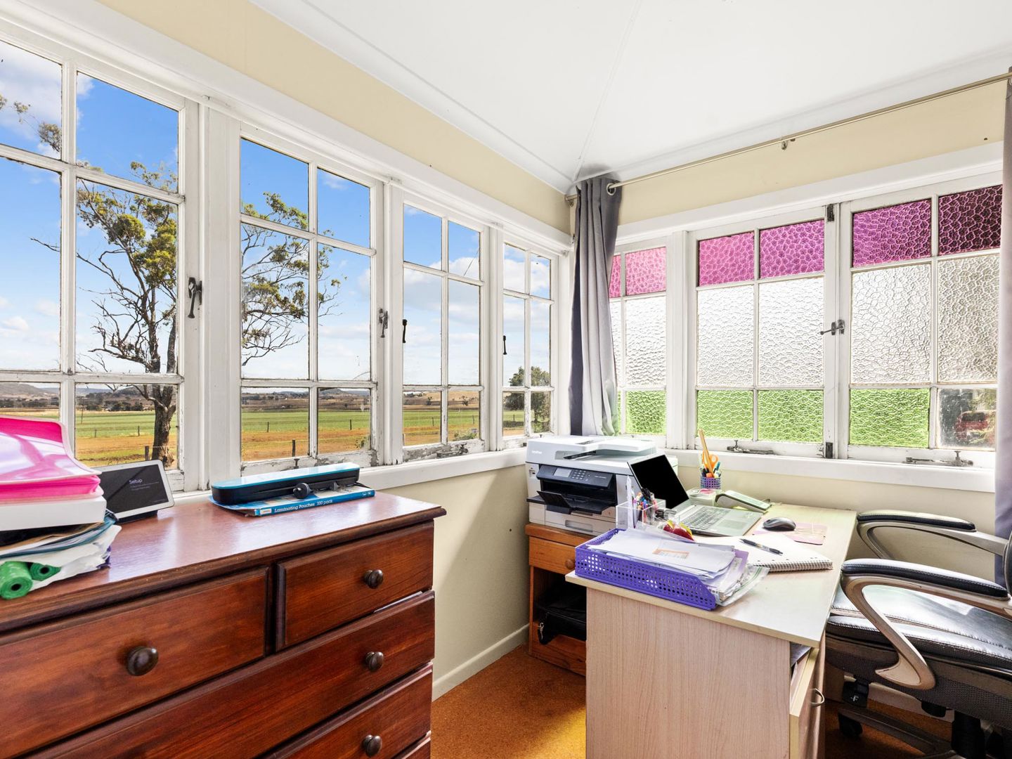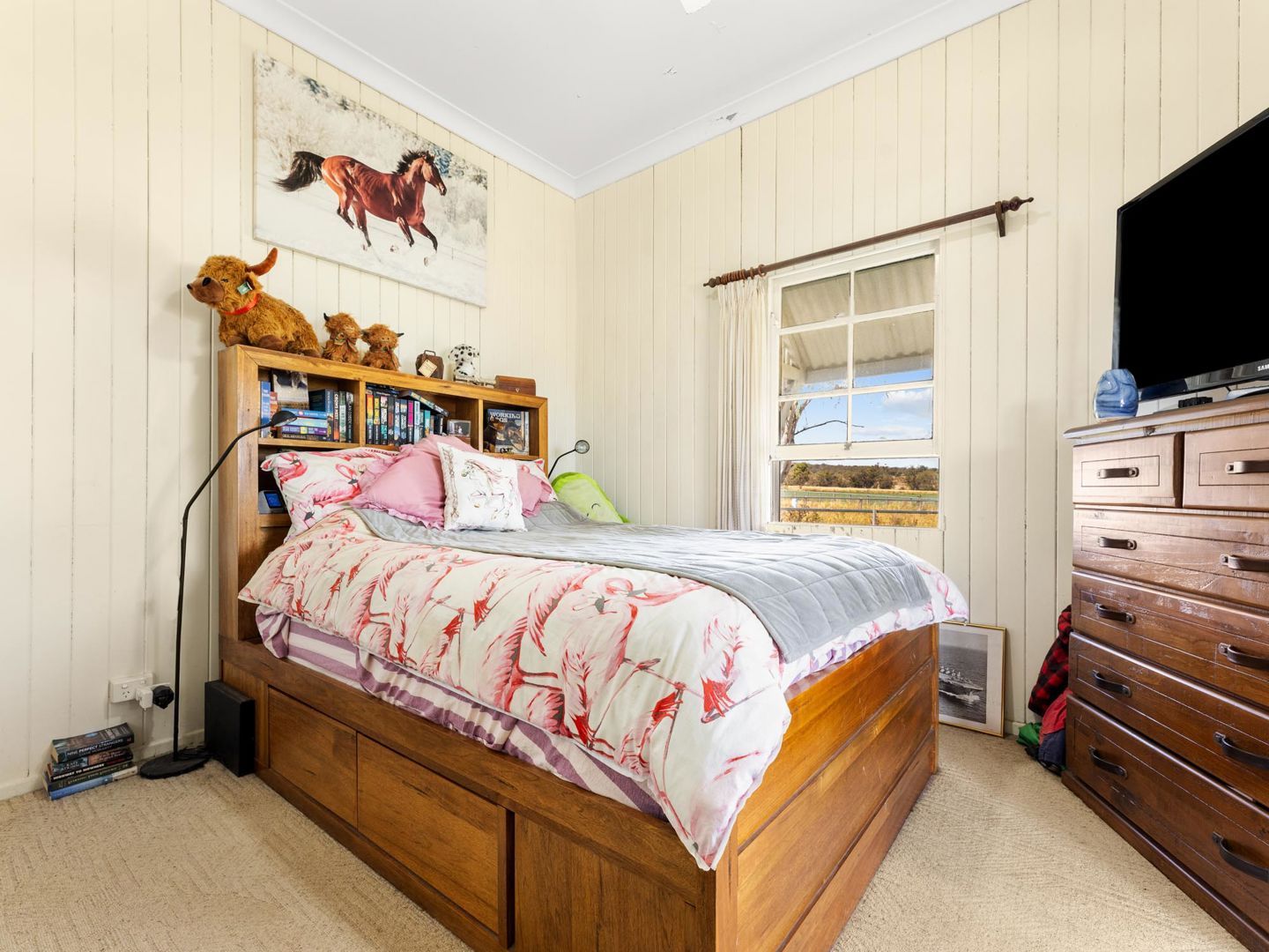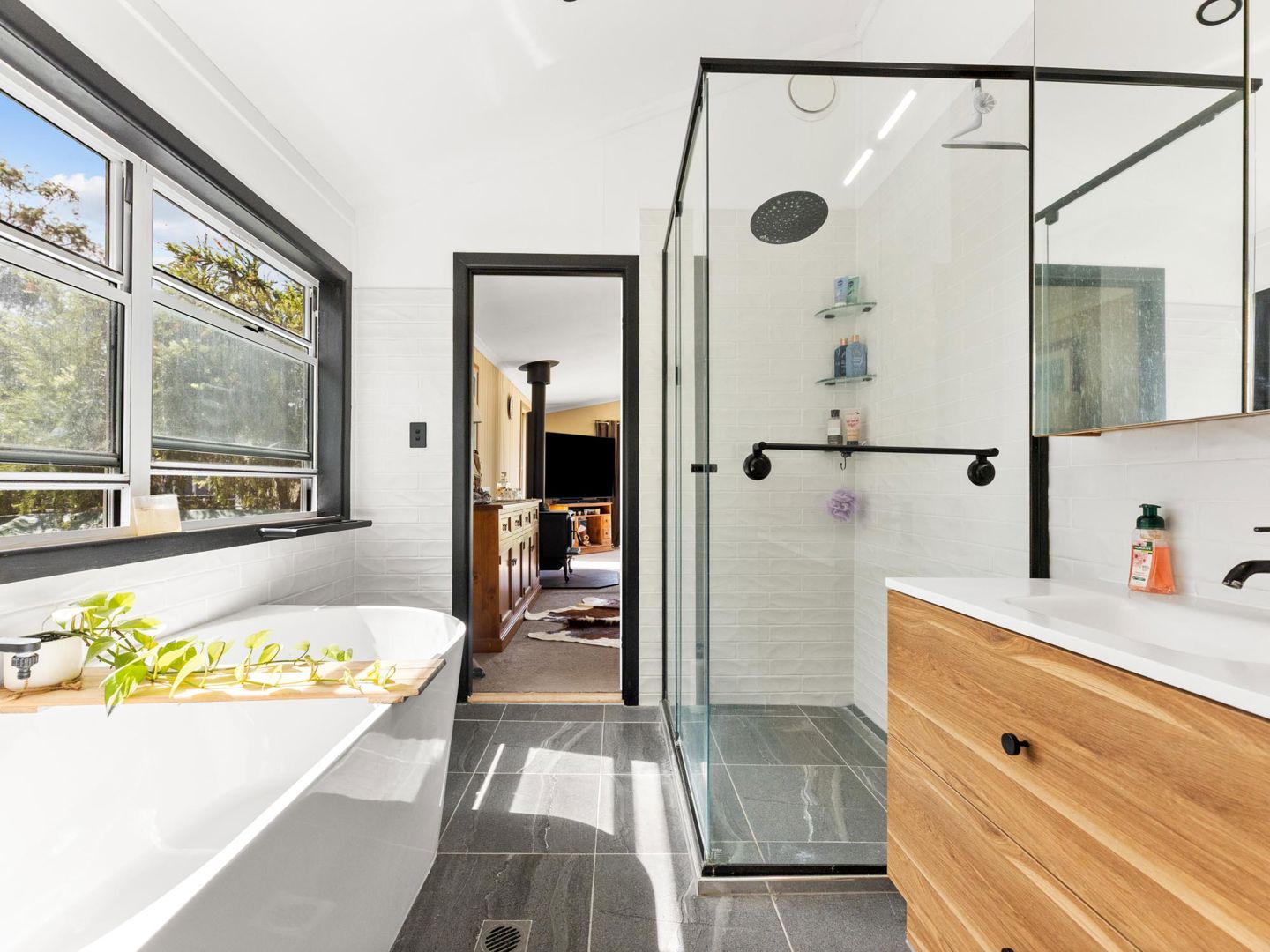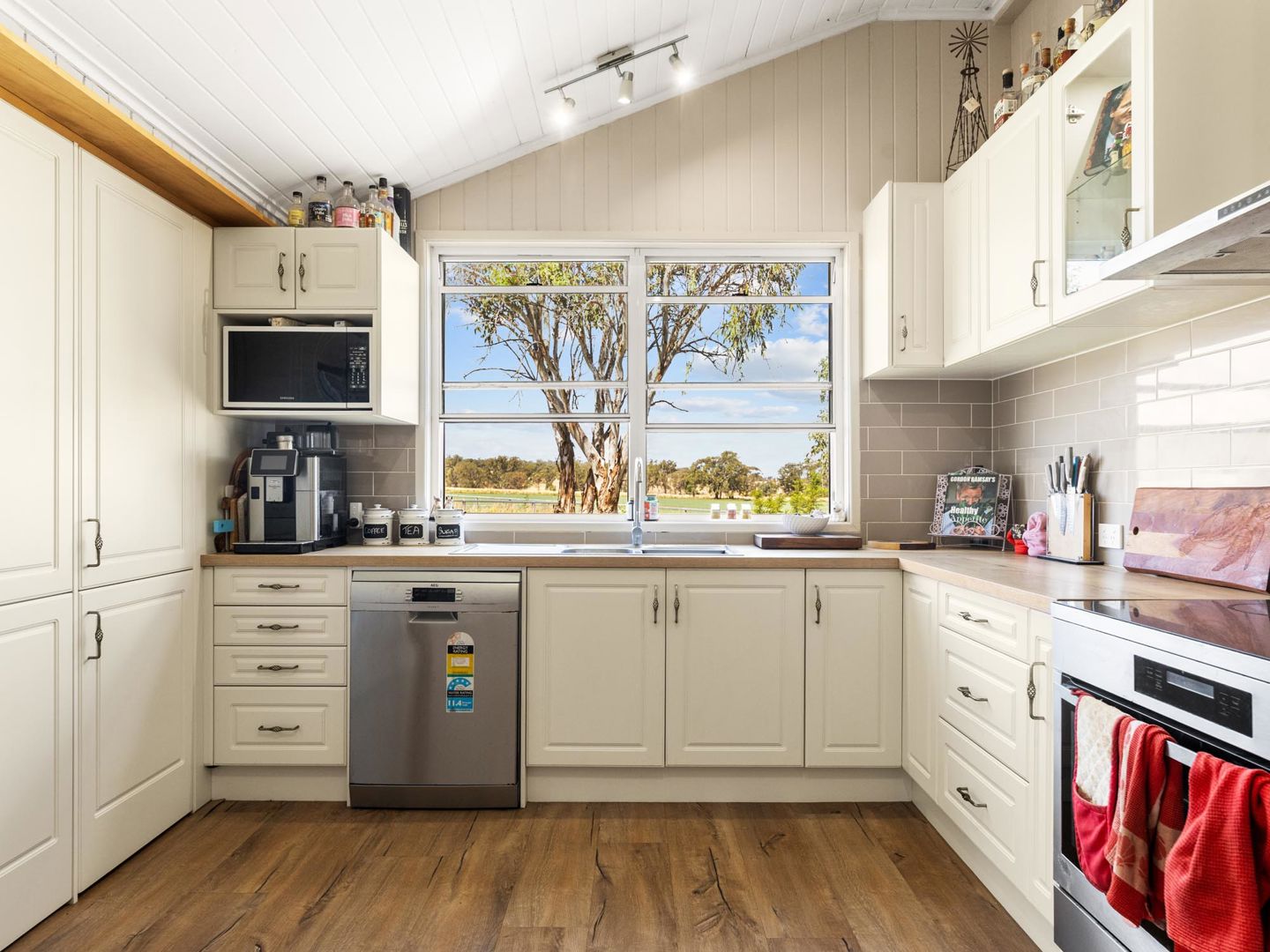 The renovated kitchen is a genuine highlight - cream shaker cabinetry, timber benchtops, grey subway tile splashback, quality appliances, and a window that perfectly frames the gum trees and open paddocks beyond.