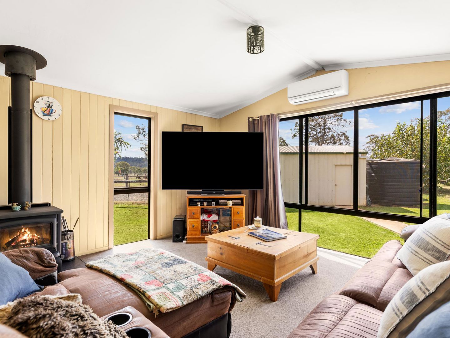 A Pacific Energy wood fire anchors the living area, reverse-cycle air conditioning keeps things comfortable year-round, and two large bedrooms with built-in robes plus a sleepout or home office round out the layout.